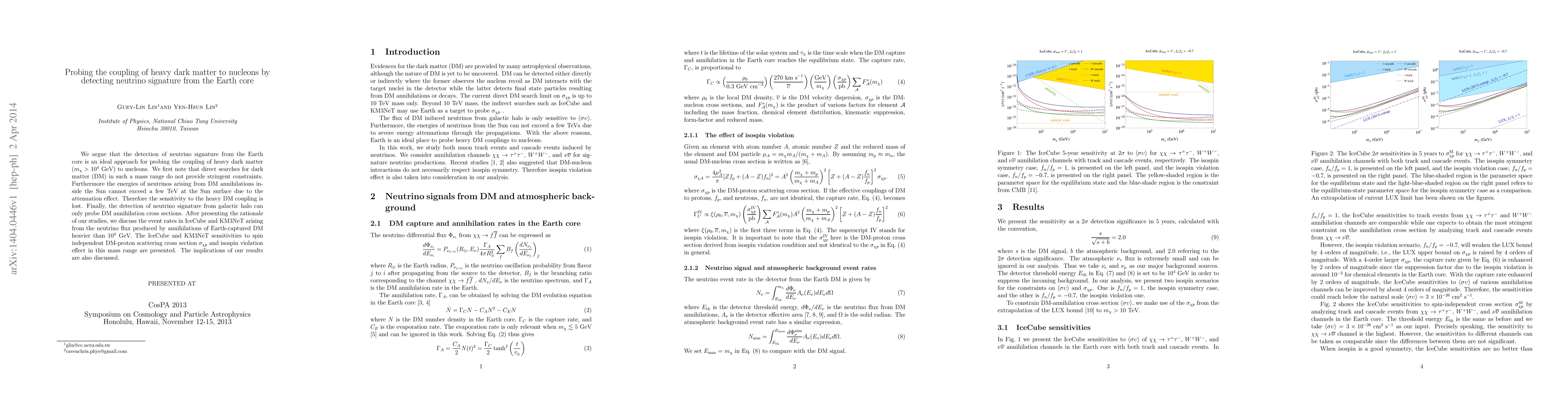 This paper proposes using neutrino signatures from the Earth core to detect the coupling of heavy dark matter ($m_{\chi}>10^{4}$ GeV) to nucleons, as direct searches and Sun-originating neutrinos fail to provide stringent constraints. It analyzes event rates in IceCube and KM3NeT to assess the sensitivity to heavy DM and its implications.