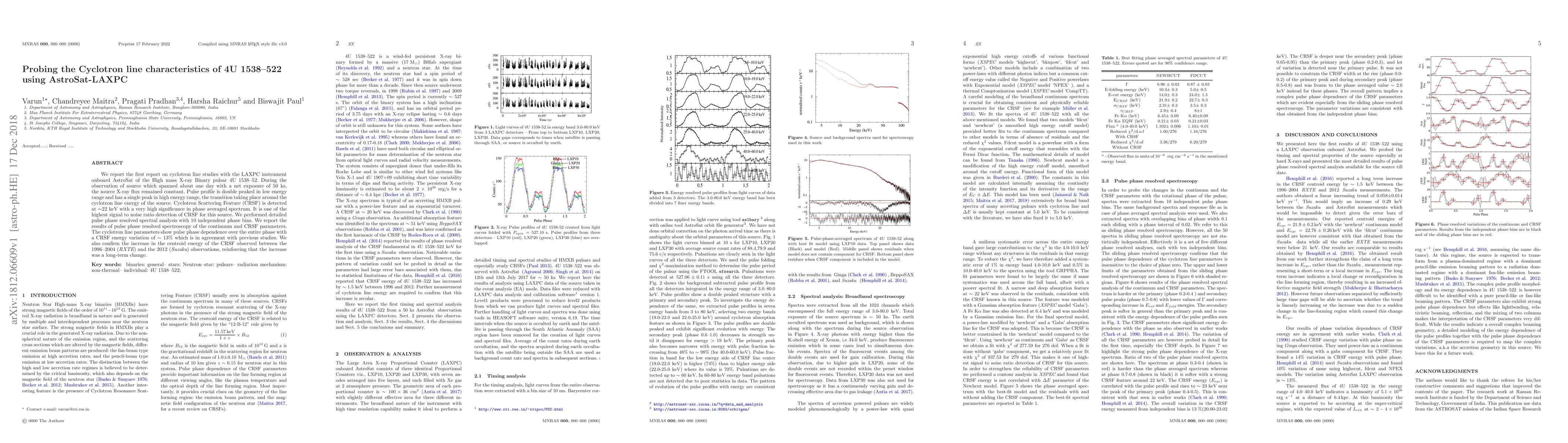 Researchers studied the cyclotron line characteristics of 4U 1538-522 using AstroSat-LAXPC, detecting a cyclotron scattering feature at ~22 keV with high significance, and observing pulse phase dependence over the entire phase.
