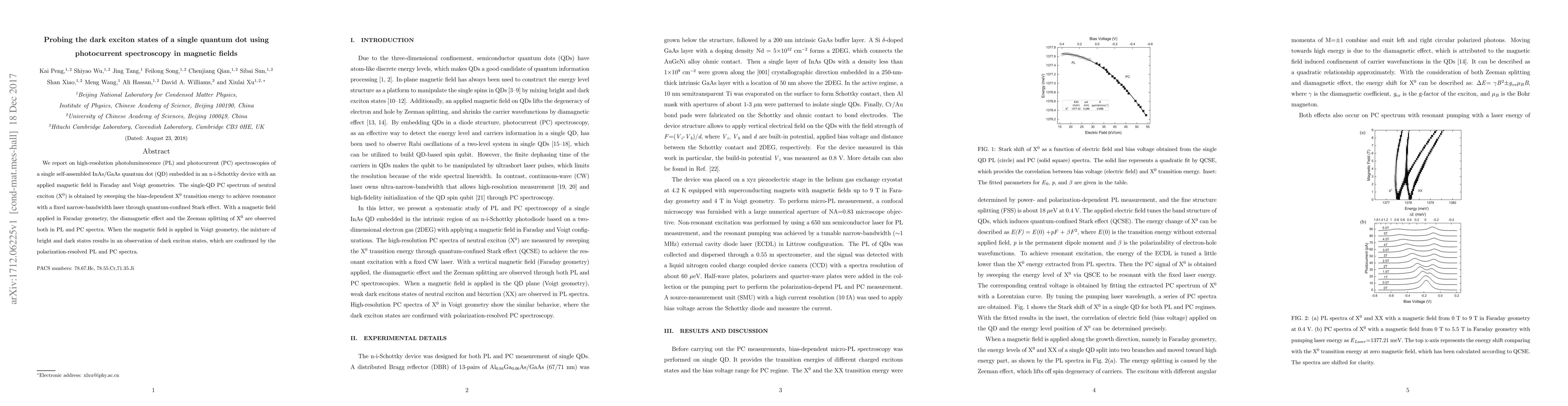 This paper investigates the dark exciton states in a single InAs/GaAs quantum dot using photocurrent spectroscopy under magnetic fields. It reveals the diamagnetic effect and Zeeman splitting of neutral excitons in Faraday geometry and observes dark exciton states in Voigt geometry through polarization-resolved spectra.