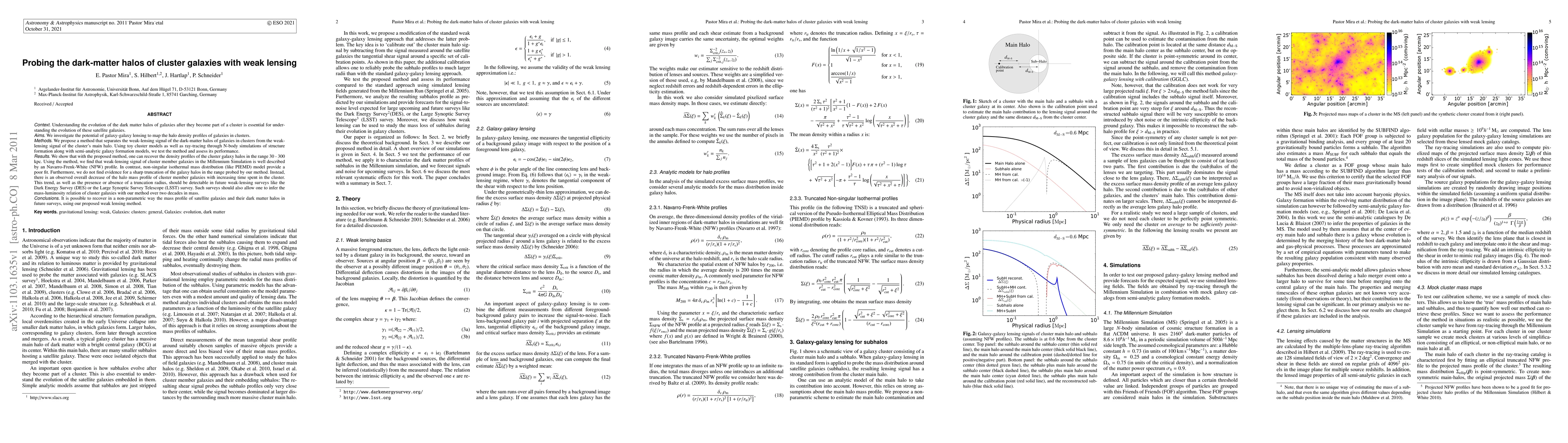 This paper proposes a method to isolate the weak-lensing signal from the dark matter halos of cluster galaxies, demonstrating its effectiveness through simulations. The results suggest that the galaxy halos follow an NFW profile and show a decrease in mass over time spent in the cluster, with no evidence of truncation.