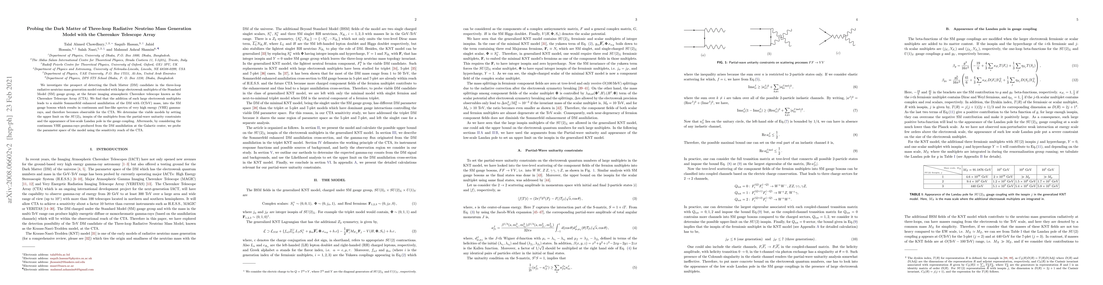 We investigate the prospect of detecting the Dark Matter (DM) candidate in the three-loop radiative neutrino mass generation model extended with large electroweak multiplets of the Standard Model (SM) gauge group, at the future imaging atmospheric Cherenkov telescope known as the Cherenkov Telescope Array (CTA). We find that the addition of such large electroweak multiplets leads to a sizable Sommerfeld enhanced annihilation of the DM with $O(\text{TeV})$ mass, into the SM gauge bosons which results in continuum and line-like spectra of very high energy (VHE) gamma-rays, and therefore becomes observable for the CTA. We determine the viable models by setting the upper limit on the $SU(2)_{L}$ isospin of the multiplets from the partial-wave unitarity constraints and the appearance of low-scale Landau pole in the gauge coupling. Afterwards, by considering the continuum VHE gamma-rays produced from the DM annihilation at the Galactic center, we probe the parameter space of the model using the sensitivity reach of the CTA.