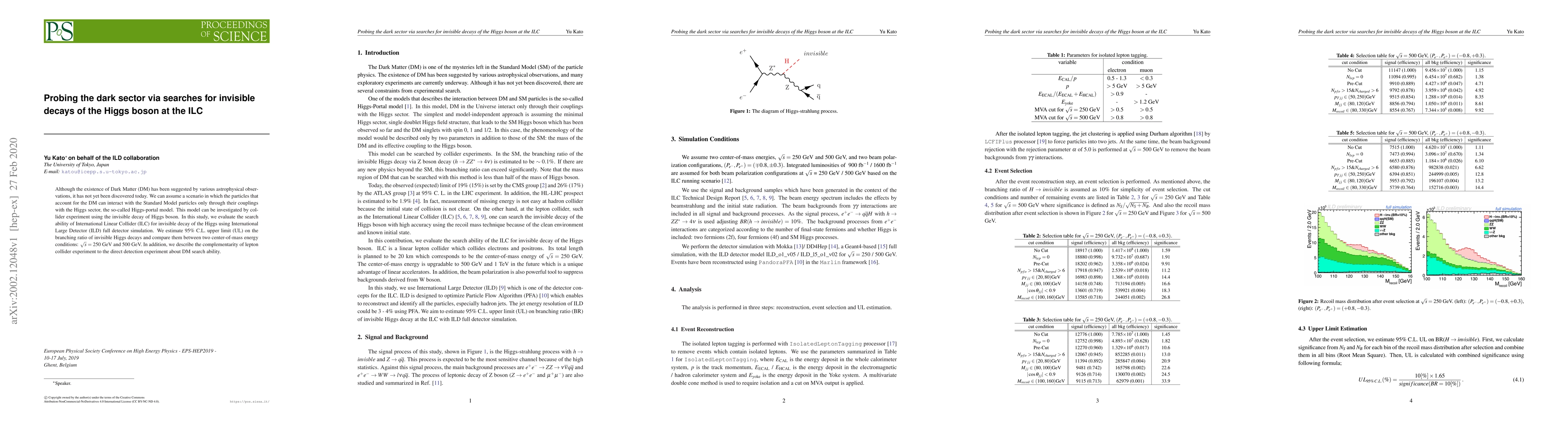 Although the existence of Dark Matter (DM) has been suggested by various astrophysical observations, it has not yet been discovered today. We can assume a scenario in which the particles that account for the DM can interact with the Standard Model particles only through their couplings with the Higgs sector, the so-called Higgs-portal model. This model can be investigated by collider experiment using the invisible decay of Higgs boson. In this study, we evaluate the search ability of International Linear Collider (ILC) for invisible decay of the Higgs using International Large Detector (ILD) full detector simulation. We estimate 95% C.L. upper limit (UL) on the branching ratio of invisible Higgs decays and compare them between two center-of-mass energy conditions: $\sqrt{s} = 250$ GeV and 500 GeV. In addition, we describe the complementarity of lepton collider experiment to the direct detection experiment about DM search ability.