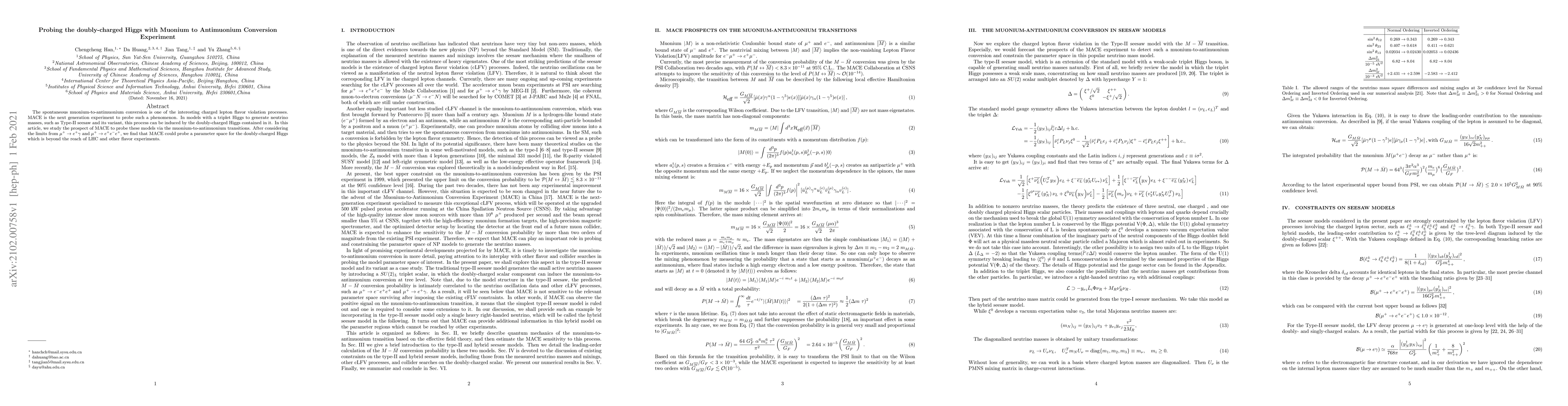 This paper investigates the potential of the MACE experiment to detect muonium-to-antimuonium conversion, a charged lepton flavor violation process driven by doubly-charged Higgs in triplet Higgs models. It finds that MACE can explore a parameter space for the doubly-charged Higgs not accessible by the LHC or other flavor experiments.