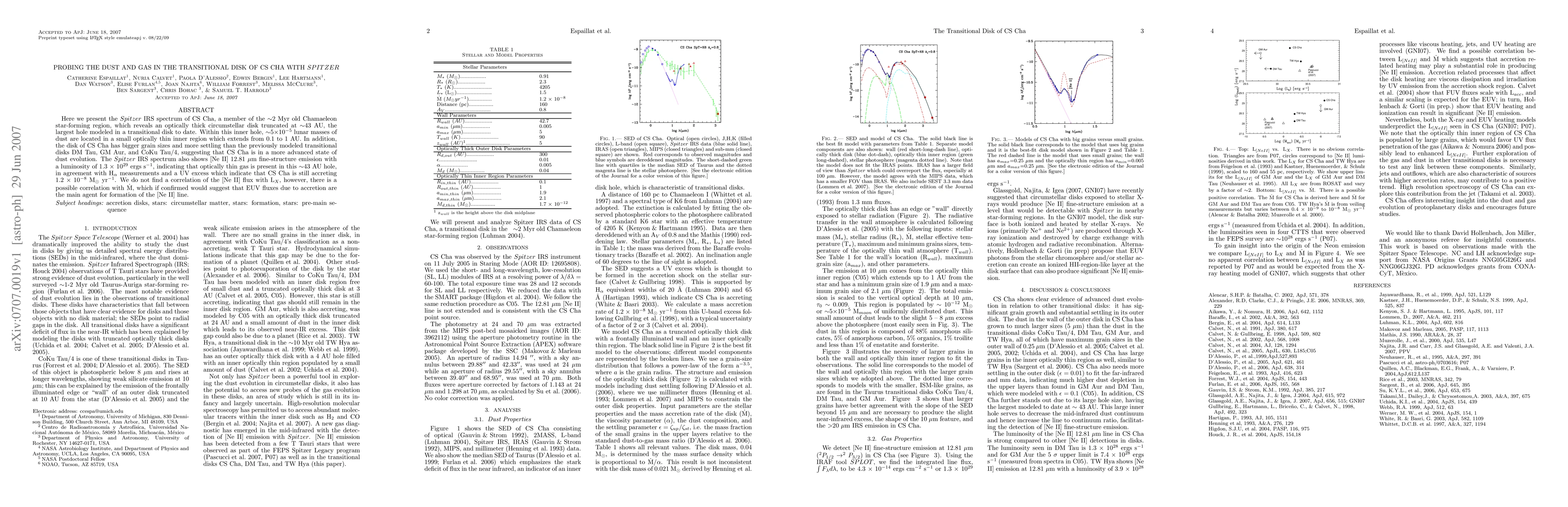 This study uses Spitzer IRS data to analyze the transitional disk of CS Cha, revealing a large inner hole and significant dust evolution. The disk shows evidence of ongoing accretion and the presence of optically thin gas, with a possible correlation between [Ne II] emission and mass accretion rate.