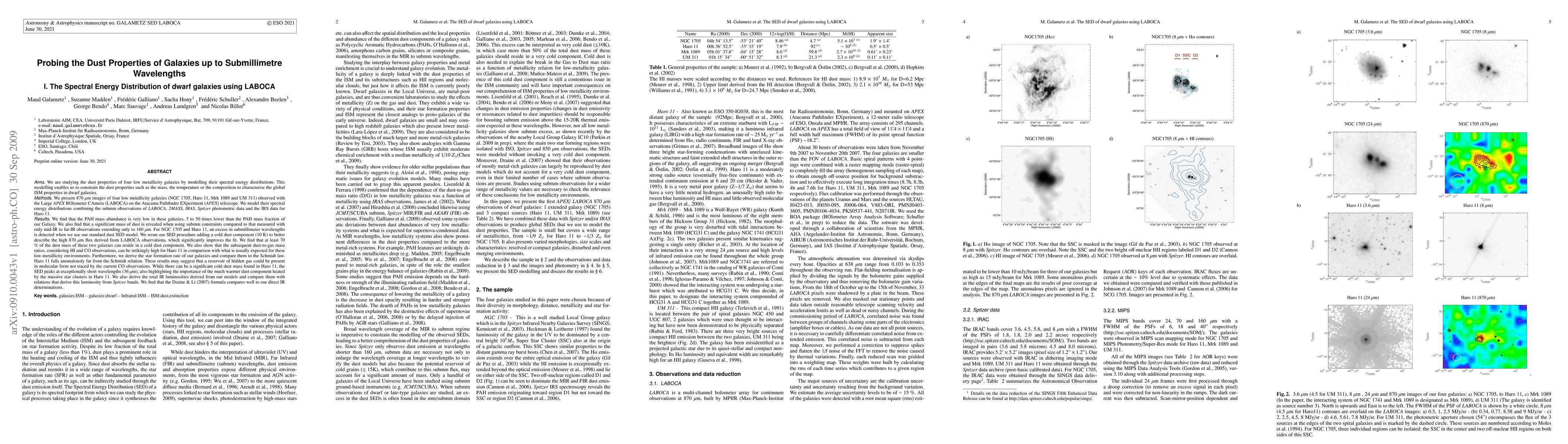 This study uses 870 micron observations from LABOCA, alongside data from 2MASS, IRAS, Spitzer, and IRS, to model the SED of four low metallicity galaxies. Key findings include a significant dust mass revealed by submm constraints, an excess in submillimeter wavelengths for NGC1705 and Haro11 best explained by a cold dust component, and unusually high dust-to-gas ratios in Haro11. The research also suggests a hidden gas reservoir in Haro11, deviating from the Schmidt law, and validates the Draine & Li (2007) formula for deriving total IR luminosities.