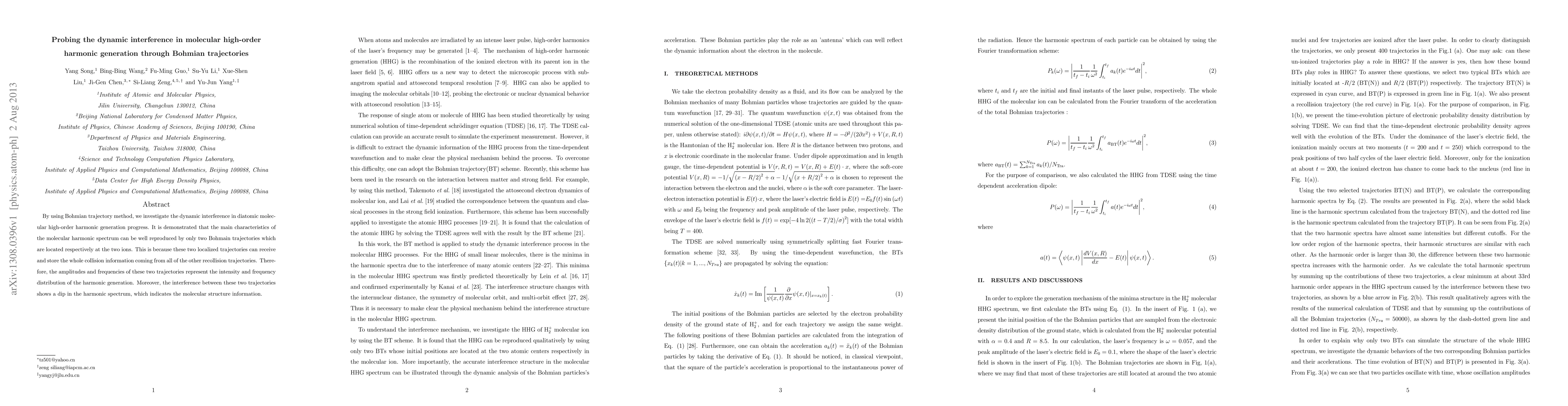 This study utilizes Bohmian trajectory method to analyze dynamic interference in diatomic molecules during high-order harmonic generation, showing that two localized trajectories at the ions can capture and represent the whole process, with their interference revealing molecular structure information.