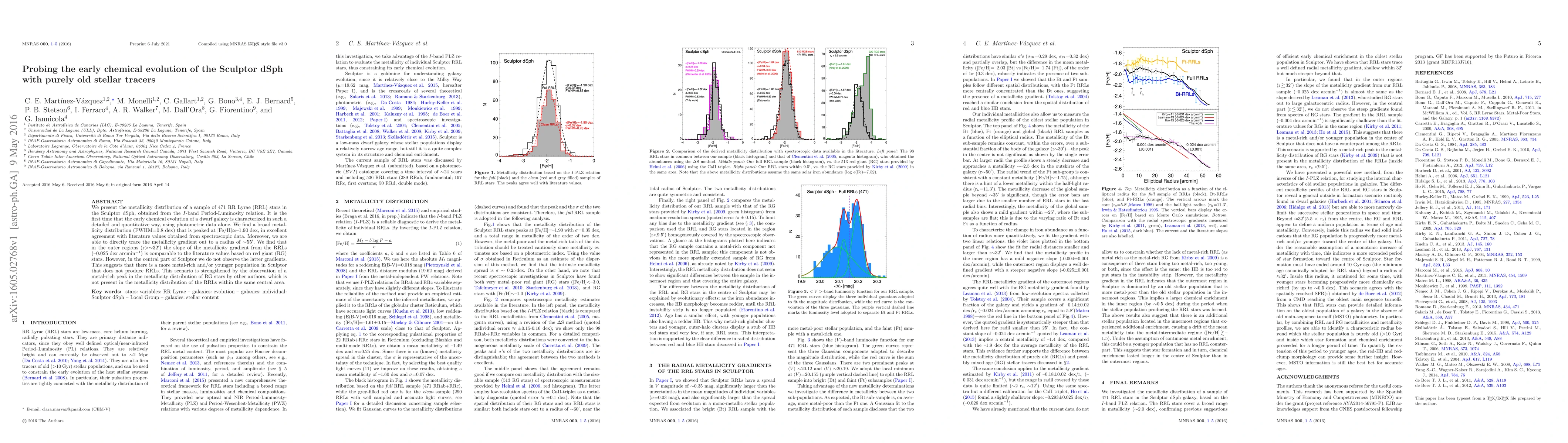 We present the metallicity distribution of a sample of 471 RR Lyrae (RRL) stars in the Sculptor dSph, obtained from the $I$-band Period-Luminosity relation. It is the first time that the early chemical evolution of a dwarf galaxy is characterized in such a detailed and quantitative way, using photometric data alone. We find a broad metallicity distribution (FWHM=0.8 dex) that is peaked at [Fe/H]$\simeq$-1.90 dex, in excellent agreement with literature values obtained from spectroscopic data. Moreover, we are able to directly trace the metallicity gradient out to a radius of $\sim$55 arcmin. We find that in the outer regions (r$>\sim$32 arcmin) the slope of the metallicity gradient from the RRLs (-0.025 dex arcmin$^{-1}$) is comparable to the literature values based on red giant (RG) stars. However, in the central part of Sculptor we do not observe the latter gradients. This suggests that there is a more metal-rich and/or younger population in Sculptor that does not produce RRLs. This scenario is strengthened by the observation of a metal-rich peak in the metallicity distribution of RG stars by other authors, which is not present in the metallicity distribution of the RRLs within the same central area.
