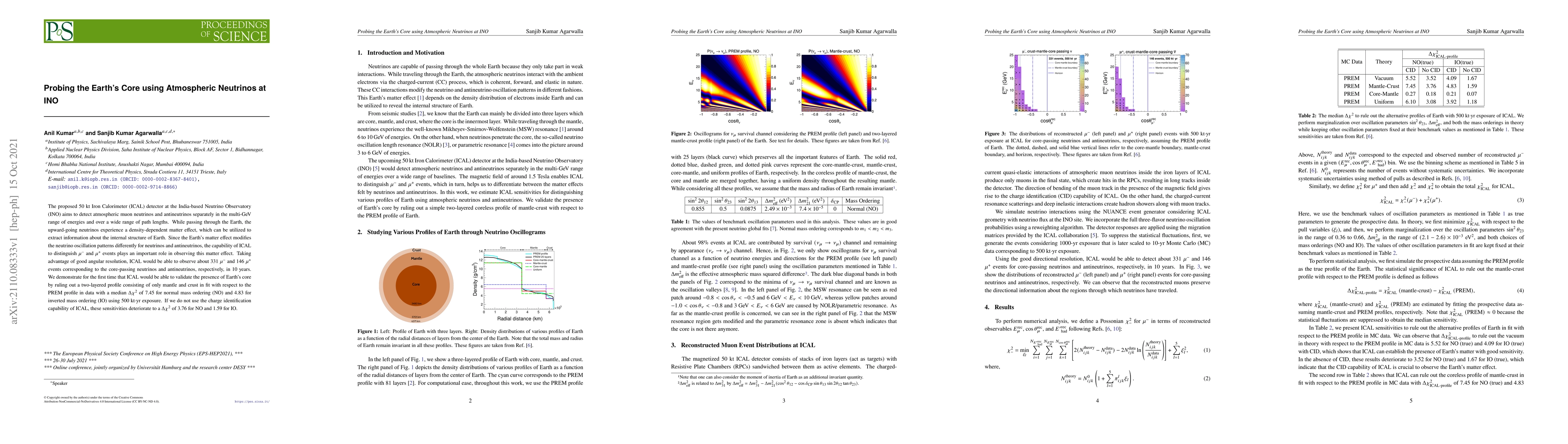 The ICAL detector at the India-based Neutrino Observatory aims to detect atmospheric neutrinos to probe Earth's core structure using matter-induced neutrino oscillation effects. The detector's ability to distinguish between muon neutrinos and antineutrinos enhances its capability to validate the presence of Earth's core, ruling out a two-layered mantle-crust model with high statistical significance.