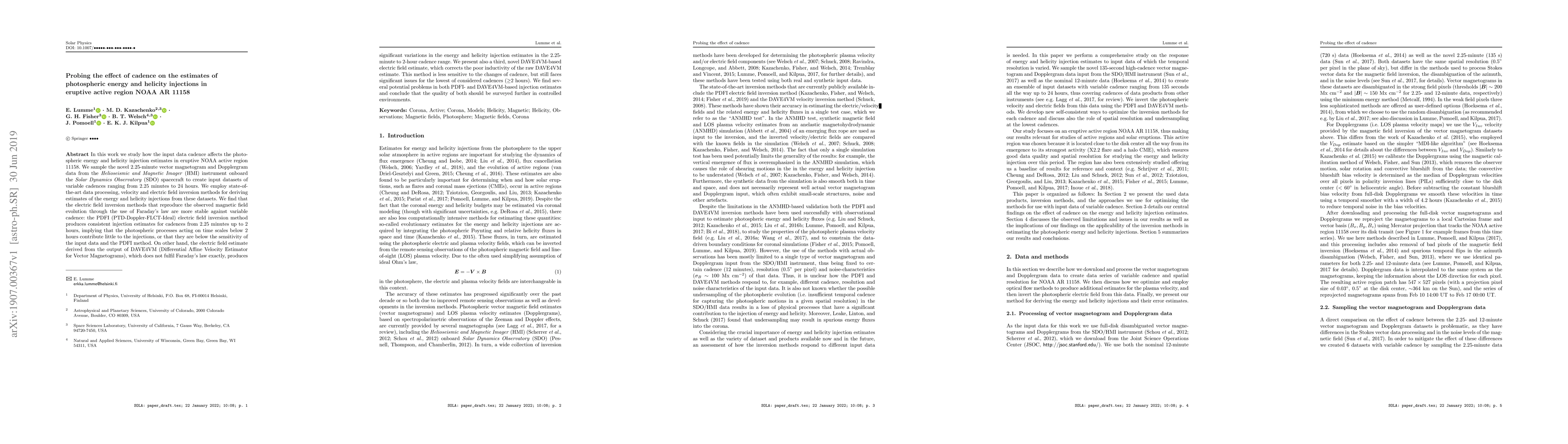 This study investigates how varying data cadences from the HMI instrument on the SDO spacecraft affect estimates of energy and helicity injections in NOAA AR 11158. The results show that the PDFI electric field inversion method provides stable estimates across different cadences, while DAVE4VM-based methods show significant variations, indicating the need for further quality assessment of both methods.