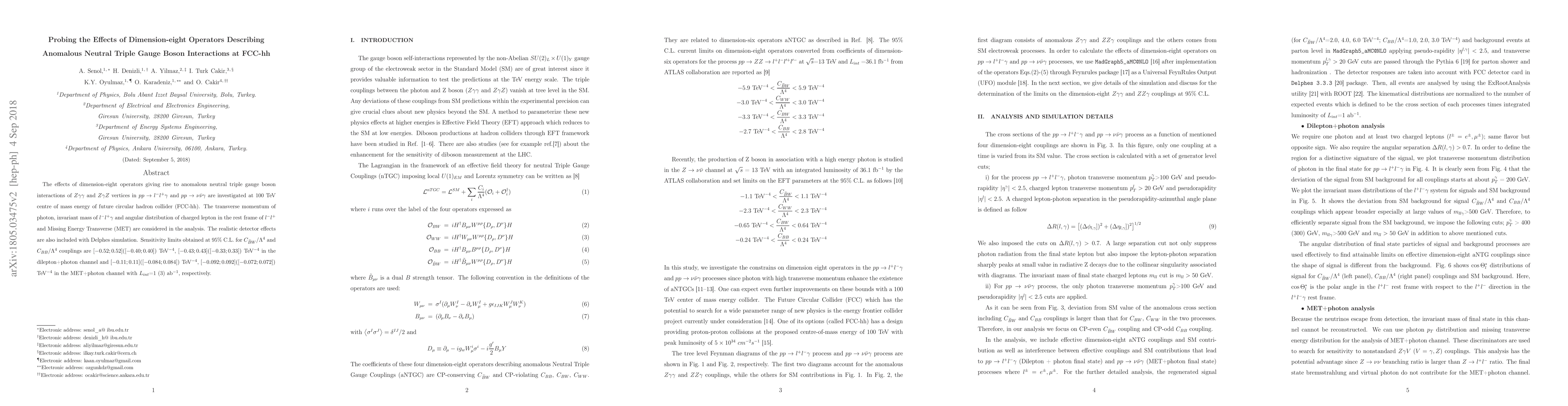 This study investigates the impact of dimension-eight operators on anomalous neutral triple gauge boson interactions at the FCC-hh collider, focusing on $Z\gamma\gamma$ and $Z\gamma Z$ vertices. Sensitivity limits for the $C_{\widetilde B W}$ and $C_{B B}$ couplings are determined, revealing significant constraints at 95% C.L. with realistic detector effects included.