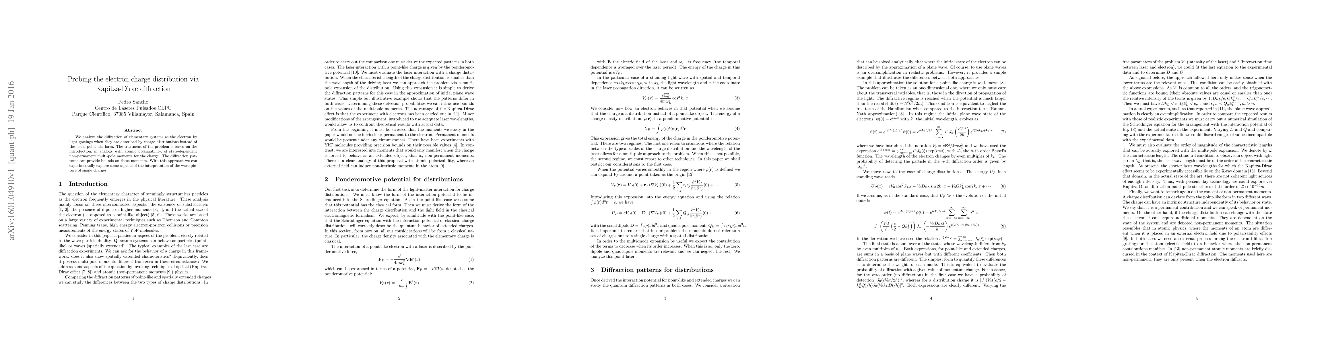 This paper explores Kapitza-Dirac diffraction of electrons using non-point charge distributions, introducing state-dependent multi-pole moments. The study aims to experimentally probe the electron's charge distribution and provide insights into the wave nature of single charges.