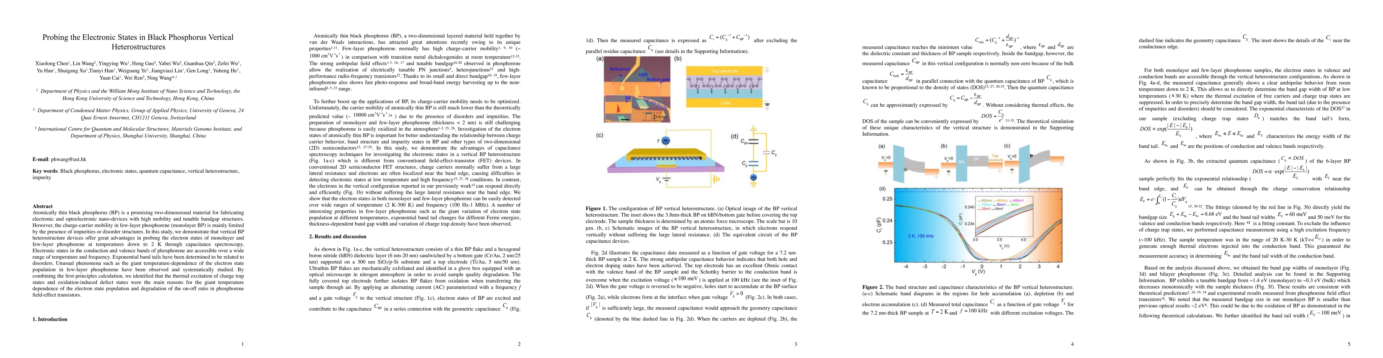 Atomically thin black phosphorus (BP) is a promising two-dimensional material for fabricating electronic and optoelectronic nano-devices with high mobility and tunable bandgap structures. However, the charge-carrier mobility in few-layer phosphorene (monolayer BP) is mainly limited by the presence of impurity and disorders. In this study, we demonstrate that vertical BP heterostructure devices offer great advantages in probing the electron states of monolayer and few-layer phosphorene at temperatures down to 2 K through capacitance spectroscopy. Electronic states in the conduction and valence bands of phosphorene are accessible over a wide range of temperature and frequency. Exponential band tails have been determined to be related to disorders. Unusual phenomena such as the large temperature-dependence of the electron state population in few-layer phosphorene have been observed and systematically studied. By combining the first-principles calculation, we identified that the thermal excitation of charge trap states and oxidation-induced defect states were the main reasons for this large temperature dependence of the electron state population and degradation of the on-off ratio in phosphorene field-effect transistors.
