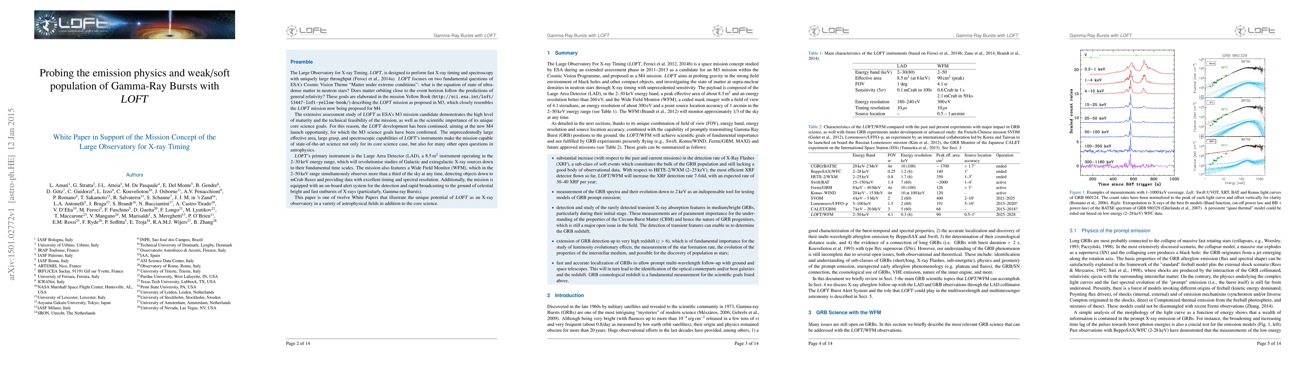 The White Paper discusses LOFT's potential for studying gamma-ray bursts, focusing on emission physics and the weak/soft population. It highlights LOFT's capacity to provide unprecedented timing and spectral resolution, enabling detailed analysis of these bursts for better understanding their properties and origins.