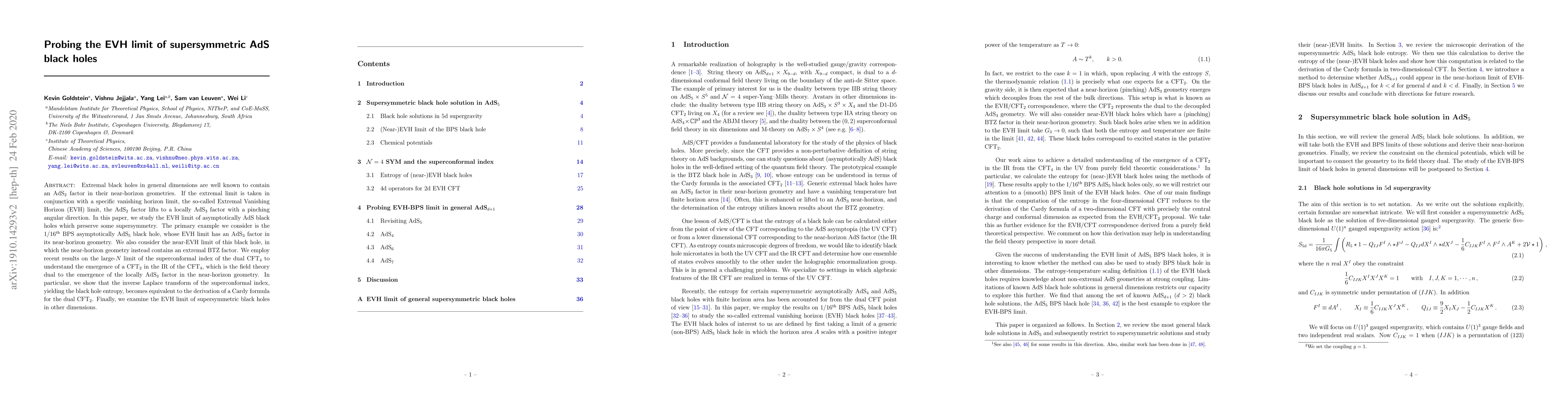 This paper investigates the Extremal Vanishing Horizon (EVH) limit of supersymmetric AdS black holes, particularly focusing on a 1/16$^{\rm th}$ BPS AdS$_5$ black hole. It reveals the emergence of a locally AdS$_3$ factor in the near-horizon geometry under the EVH limit and relates it to a Cardy formula for a dual CFT$_2$, using the superconformal index of the CFT$_4$.