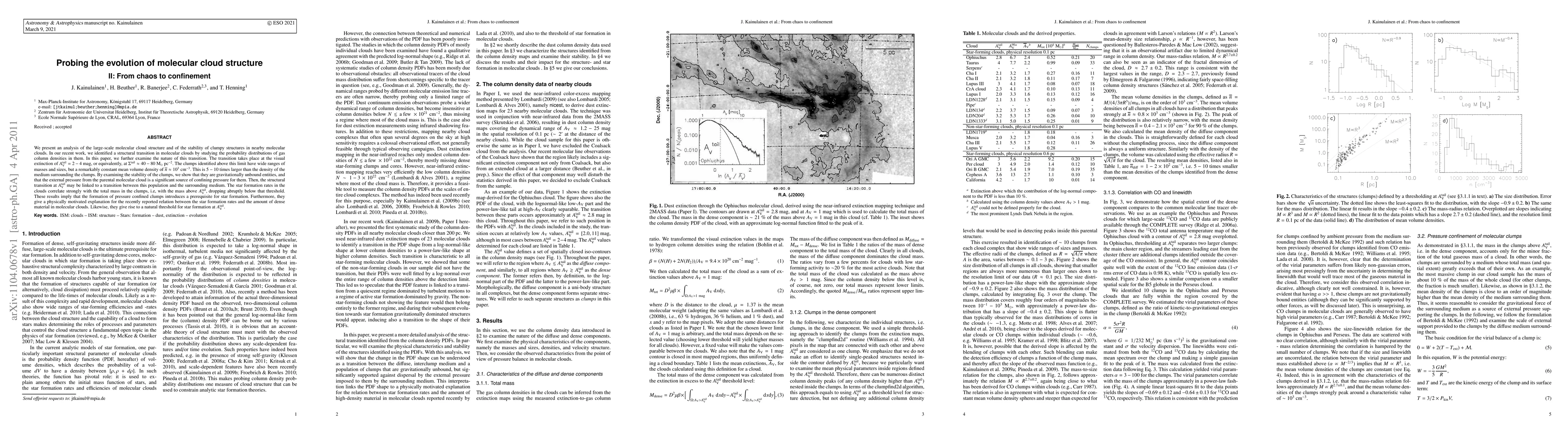 We present an analysis of the large-scale molecular cloud structure and of the stability of clumpy structures in nearby molecular clouds. In our recent work, we identified a structural transition in molecular clouds by studying the probability distributions of gas column densities in them. In this paper, we further examine the nature of this transition. The transition takes place at the visual extinction of A_V^tail = 2-4 mag, or equivalently, at \Sigma^tail = 40-80 Ms pc^{-2}. The clumps identified above this limit have wide ranges of masses and sizes, but a remarkably constant mean volume density of n = 10^3 cm^{-3}. This is 5-10 times larger than the density of the medium surrounding the clumps. By examining the stability of the clumps, we show that they are gravitationally unbound entities, and that the external pressure from the parental molecular cloud is a significant source of confining pressure for them. Then, the structural transition at A_V^tail may be linked to a transition between this population and the surrounding medium. The star formation rates in the clouds correlate strongly with the total mass in the clumps, i.e, with the mass above A_V^tail, dropping abruptly below that threshold. These results imply that the formation of pressure confined clumps introduces a prerequisite for star formation. Furthermore, they give a physically motivated explanation for the recently reported relation between the star formation rates and the amount of dense material in molecular clouds. Likewise, they give rise to a natural threshold for star formation at A_V^tail.