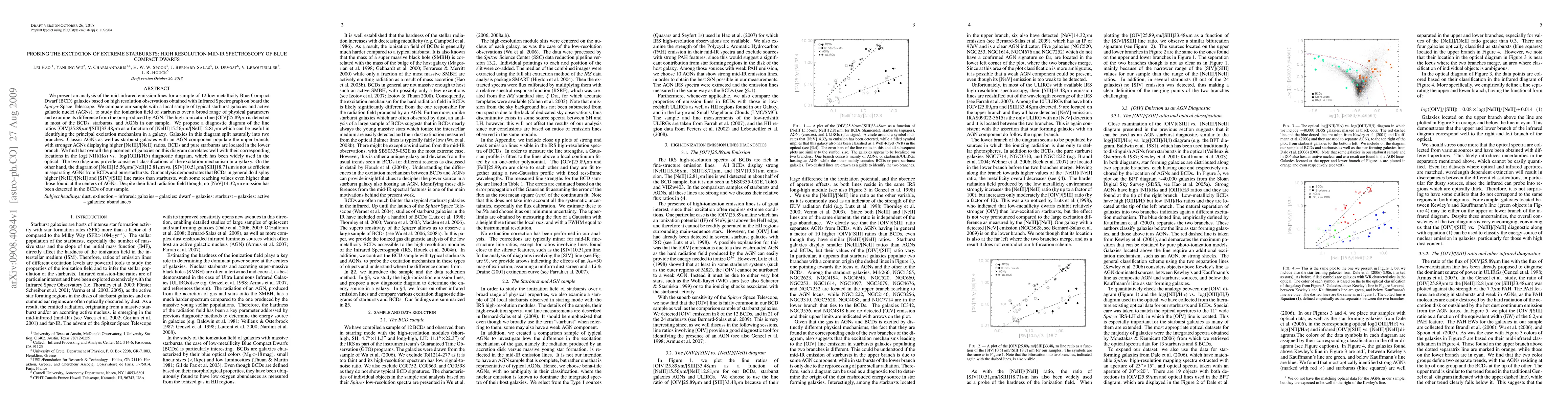 We present an analysis of the mid-infrared emission lines for a sample of 12 low metallicity Blue Compact Dwarf (BCD) galaxies based on high resolution observations obtained with Infrared Spectrograph on board the {\rm Spitzer} Space Telescope. We compare our sample with a local sample of typical starburst galaxies and active galactic nuclei (AGNs), to study the ionization field of starbursts over a broad range of physical parameters and examine its difference from the one produced by AGN. The high-ionization line [OIV]25.89$\mu$m is detected in most of the BCDs, starbursts, and AGNs in our sample. We propose a diagnostic diagram of the line ratios [OIV]25.89$\mu$m/[SIII]33.48$\mu$m as a function of [NeIII]15.56$\mu$m/[NeII]12.81$\mu$m which can be useful in identifying the principal excitation mechanism in a galaxy. Galaxies in this diagram split naturally into two branches. Classic AGNs as well as starburst galaxies with an AGN component populate the upper branch, with stronger AGNs displaying higher [NeIII]/[NeII] ratios. BCDs and pure starbursts are located in the lower branch. We find that overall the placement of galaxies on this diagram correlates well with their corresponding locations in the log([NII]/H$\alpha$) vs. log([OIII]/H$\beta$) diagnostic diagram, which has been widely used in the optical. The two diagrams provide consistent classifications of the excitation mechanism in a galaxy. On the other hand, the diagram of [NeIII]15.56$\mu$m/[NeII]12.81$\mu$m vs. [SIV]10.51$\mu$m/[SIII]18.71$\mu$m is not as efficient in separating AGNs from BCDs and pure starbursts. (abridged)