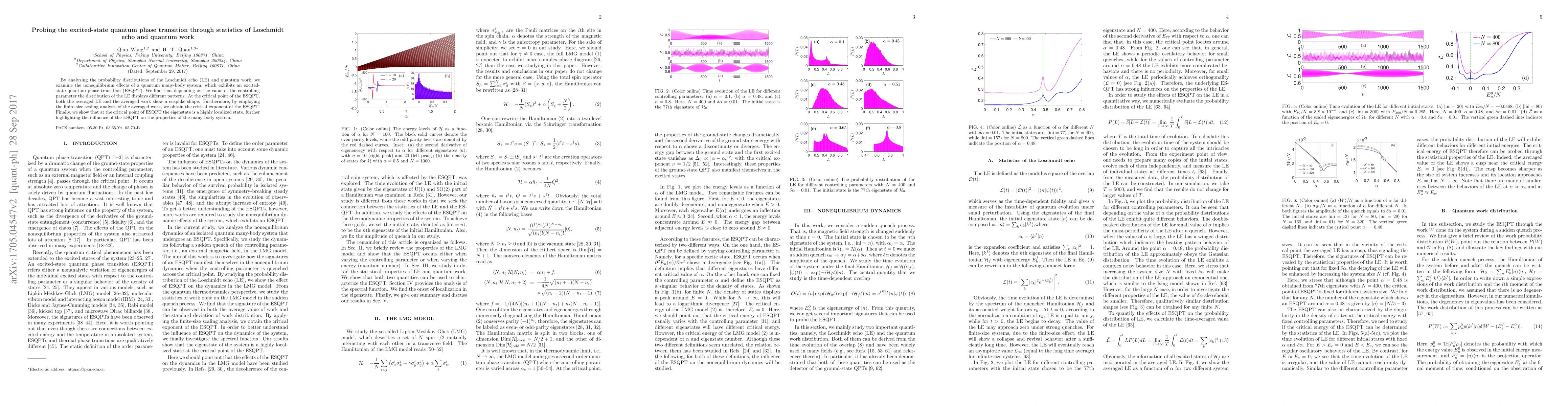 By analyzing the probability distributions of the Loschmidt echo (LE) and quantum work, we examine the nonequilibrium effects of a quantum many-body system, which exhibits an excited-state quantum phase transition (ESQPT). We find that depending on the value of the controlling parameter the distribution of the LE displays different patterns. At the critical point of the ESQPT, both the averaged LE and the averaged work show a cusplike shape. Furthermore, by employing the finite-size scaling analysis of the averaged work, we obtain the critical exponent of the ESQPT. Finally, we show that at the critical point of ESQPT the eigenstate is a highly localized state, further highlighting the influence of the ESQPT on the properties of the many-body system.