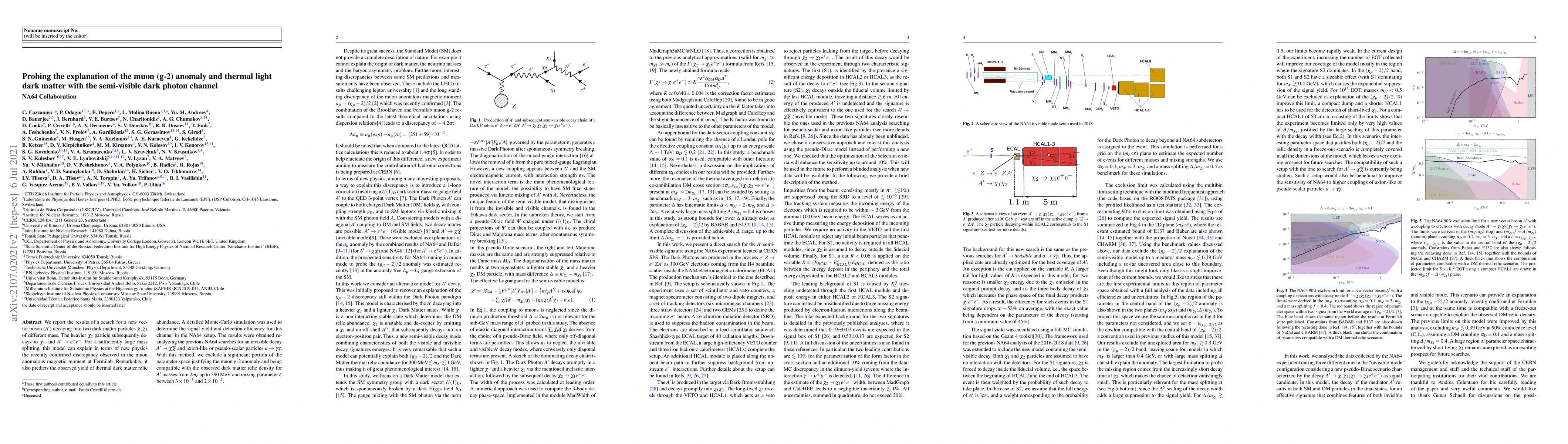 We report the results of a search for a new vector boson ($A'$) decaying into two dark matter particles $\chi_1 \chi_2$ of different mass. The heavier $\chi_2$ particle subsequently decays to $\chi_1$ and $A' \to e^- e^+$. For a sufficiently large mass splitting, this model can explain in terms of new physics the recently confirmed discrepancy observed in the muon anomalous magnetic moment at Fermilab. Remarkably, it also predicts the observed yield of thermal dark matter relic abundance. A detailed Monte-Carlo simulation was used to determine the signal yield and detection efficiency for this channel in the NA64 setup. The results were obtained re-analyzing the previous NA64 searches for an invisible decay $A'\to \chi \overline{\chi}$ and axion-like or pseudo-scalar particles $a \to \gamma \gamma$. With this method, we exclude a significant portion of the parameter space justifying the muon g-2 anomaly and being compatible with the observed dark matter relic density for $A'$ masses from 2$m_e$ up to 390 MeV and mixing parameter $\epsilon$ between $3\times10^{-5}$ and $2\times10^{-2}$.