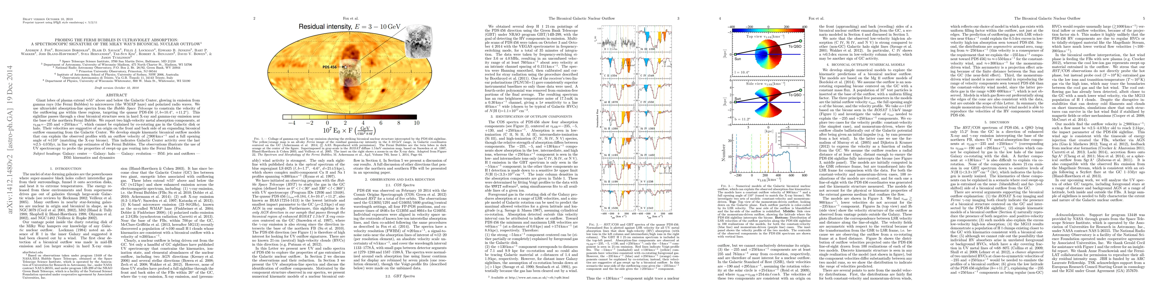 This paper uses ultraviolet absorption-line spectra to investigate the Fermi Bubbles, revealing high-velocity metal absorption components indicative of a biconical outflow from the Galactic Center. The findings suggest an outflow velocity of ~900 km/s and support the existence of Galactic Center activity over the past 2.5-4.0 million years.