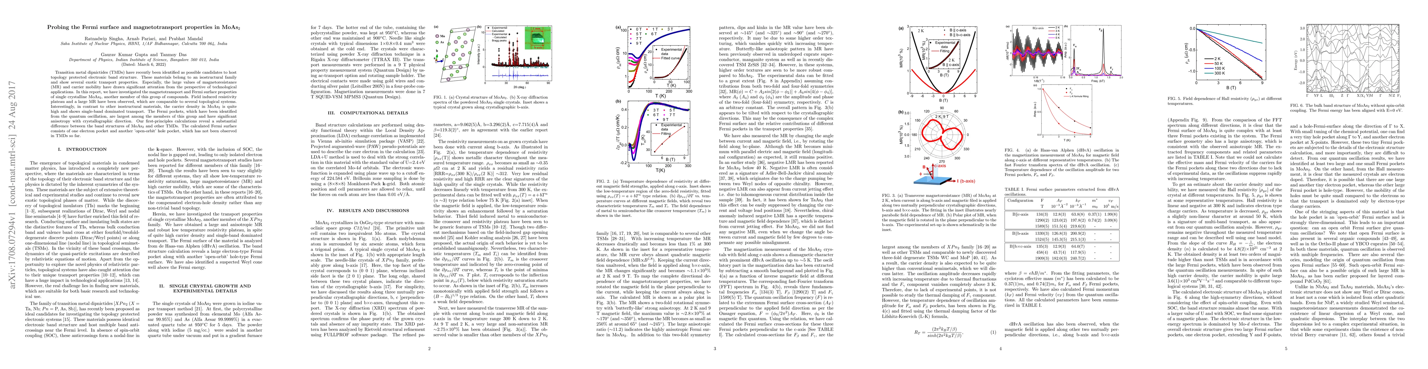 Transition metal dipnictides (TMDs) have recently been identified as possible candidates to host topology protected electronic band structure. These materials belong to an isostructural family and show several exotic transport properties. Especially, the large values of magnetoresistance (MR) and carrier mobility have drawn significant attention from the perspective of technological applications. In this report, we have investigated the magnetotransport and Fermi surface properties of single crystalline MoAs$_{2}$, another member of this group of compounds. Field induced resistivity plateau and a large MR have been observed, which are comparable to several topological systems. Interestingly, in contrast to other isostructural materials, the carrier density in MoAs$_{2}$ is quite high and shows single-band dominated transport. The Fermi pockets, which have been identified from the quantum oscillation, are largest among the members of this group and have significant anisotropy with crystallographic direction. Our first-principles calculations reveal a substantial difference between the band structures of MoAs$_{2}$ and other TMDs. The calculated Fermi surface consists of one electron pocket and another 'open-orbit' hole pocket, which has not been observed in TMDs so far.
