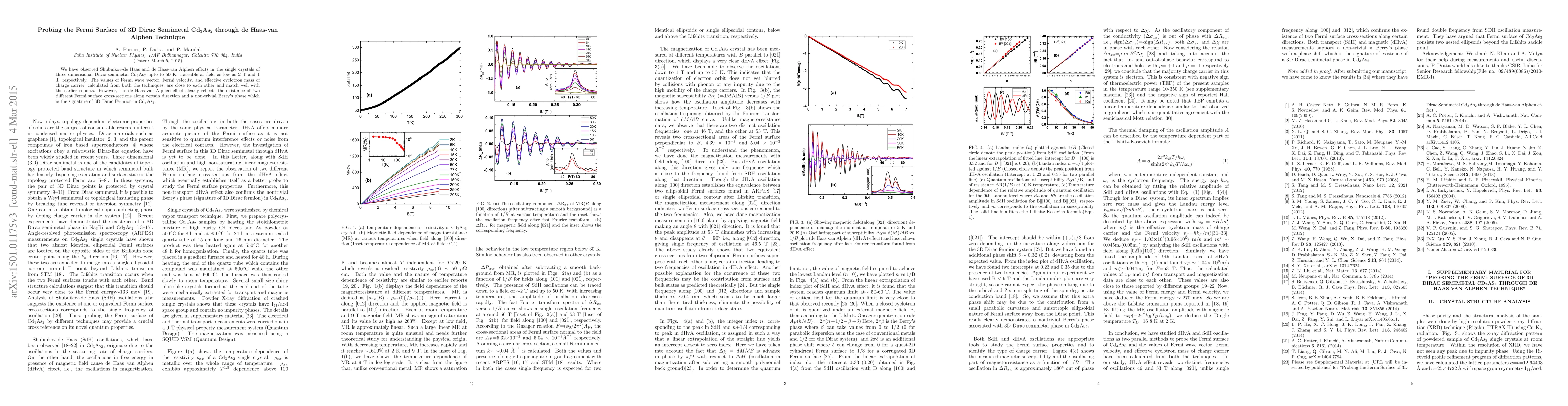 We have observed Shubnikov-de Haas and de Haas-van Alphen effect in the single crystals of three dimensional Dirac semimetal Cd$_{3}$As$_{2}$ upto 50 K, traceable at field as low as 2 T and 1 T, respectively. The values of Fermi wave vector, Fermi velocity, and effective cyclotron mass of charge carrier, calculated from both the techniques, are close to each other and match well with the earlier reports. However, the de Haas-van Alphen effect clearly reflects the existence of two different Fermi surface cross-sections along certain direction and a non-trivial Berry's phase which is the signature of 3D Dirac Fermion in Cd$_{3}$As$_{2}$.