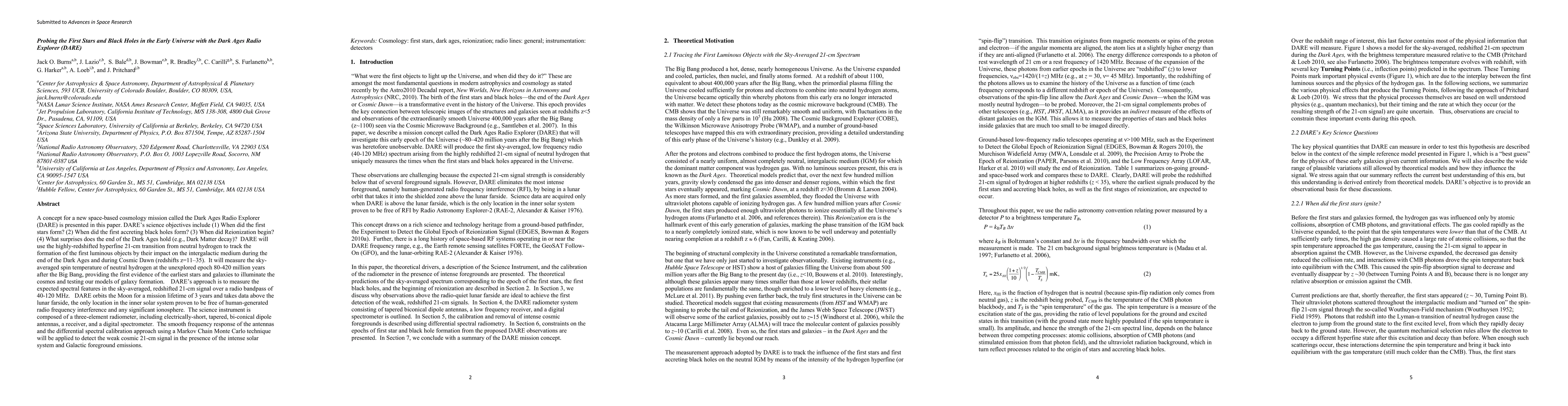 This paper proposes the Dark Ages Radio Explorer (DARE) mission to study the formation of the first stars and black holes, and the onset of Reionization. DARE aims to detect the redshifted 21-cm signal from neutral hydrogen to explore the universe's earliest luminous objects, operating in a radio bandpass of 40-120 MHz and orbiting the Moon to avoid interference.