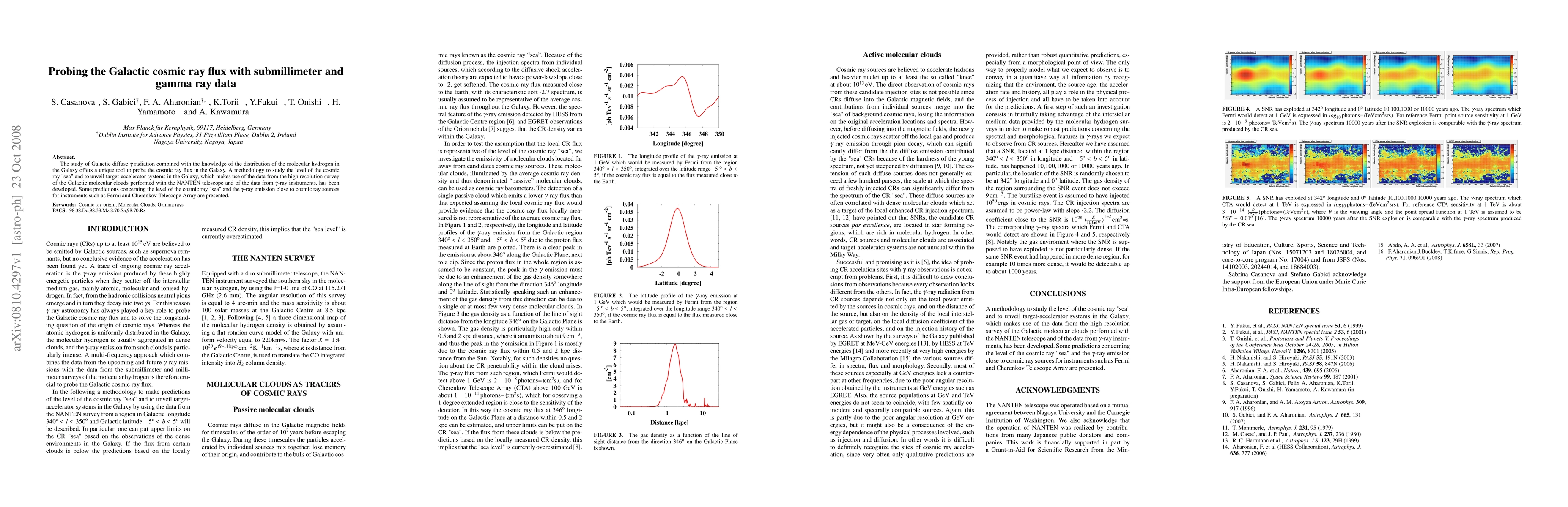 This paper develops a methodology to study the Galactic cosmic ray flux using submillimeter and gamma-ray data from the NANTEN telescope and gamma-ray instruments. Predictions are made regarding cosmic ray levels and gamma-ray emissions for future instruments like Fermi and Cherenkov Telescope Array.