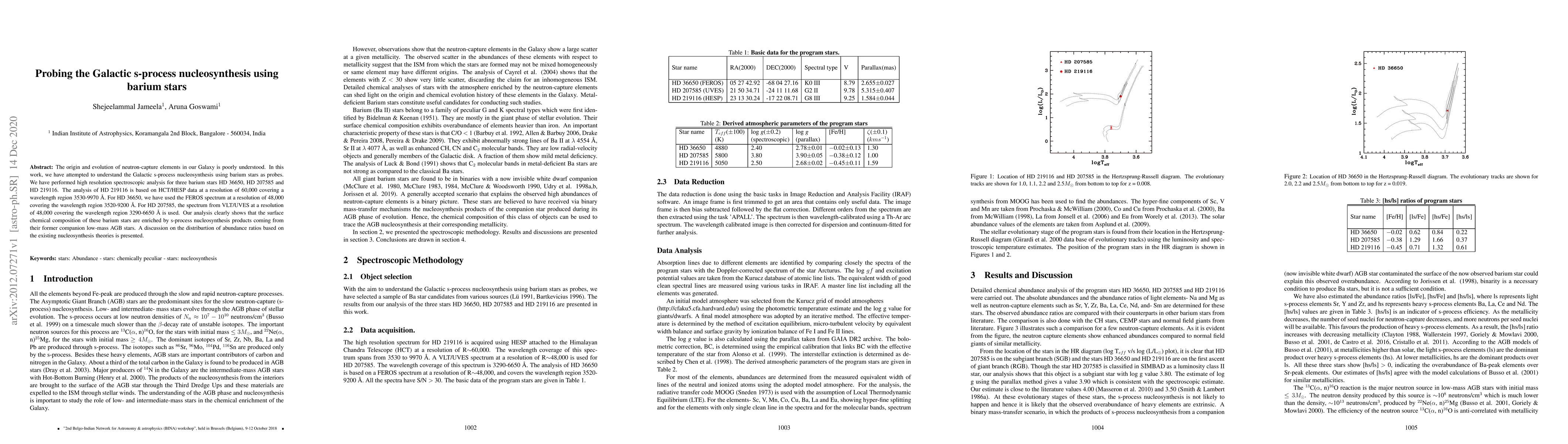 This research investigates the Galactic s-process nucleosynthesis through high-resolution spectroscopic analysis of three barium stars, revealing that their enriched surface compositions are due to s-process elements transferred from former low-mass AGB companion stars. The study discusses the implications for existing nucleosynthesis theories based on the observed abundance ratios.