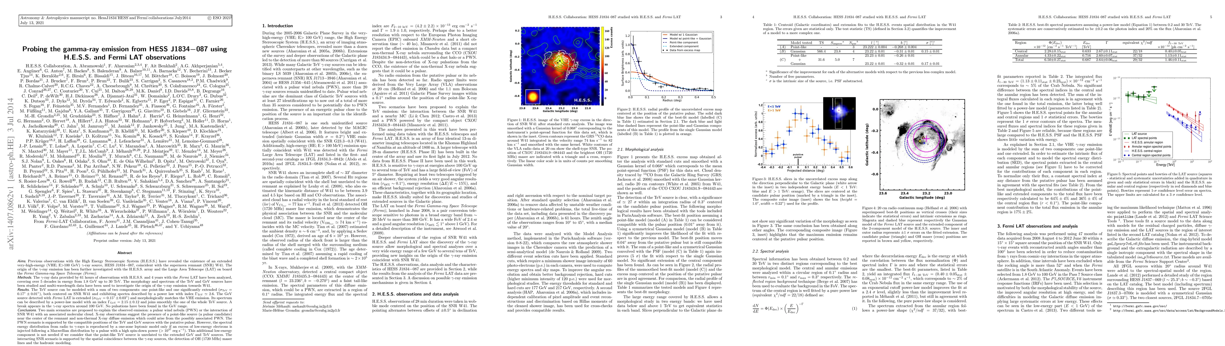 This study investigates the gamma-ray emission from HESS J1834-087 using H.E.S.S. and Fermi LAT observations, revealing two components: a point-like and an extended source. The emission is modeled by a pulsar wind nebula or the interaction of SNR W41 with a molecular cloud, with the latter supported by spatial coincidence and maser line detection.