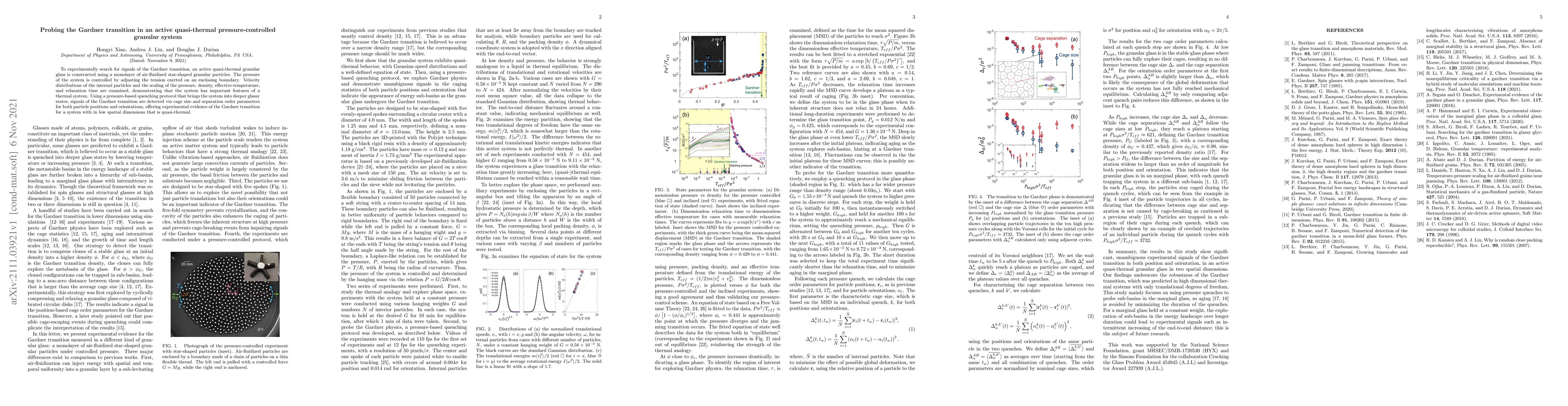 This study constructs an active quasi-thermal granular glass using star-shaped particles and controls its pressure to investigate the Gardner transition. Experimental evidence of the transition is found through pressure-based quenching and analysis of particle cage size and separation order parameters.