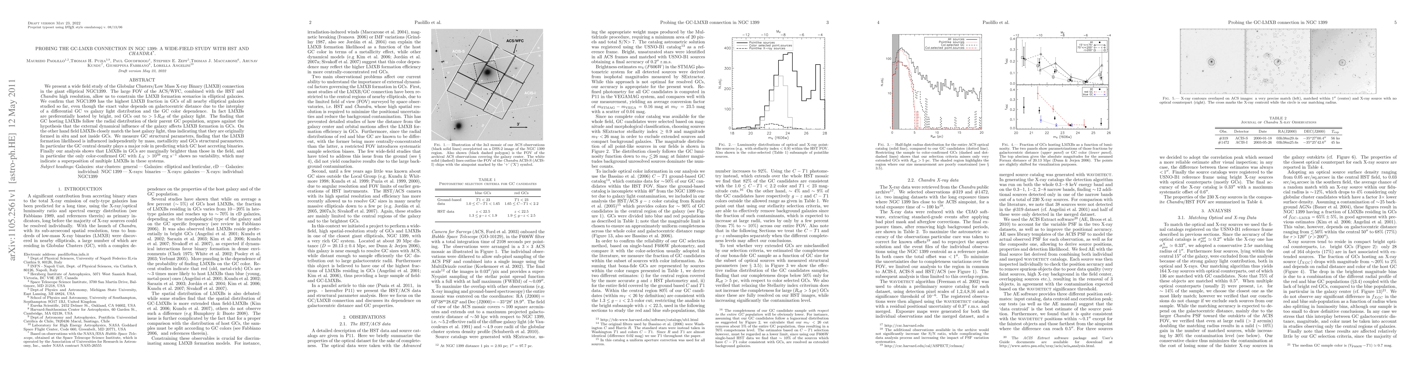 We present a wide field study of the Globular Clusters/Low Mass X-ray Binary (LMXB) connection in the giant elliptical NGC1399. The large FOV of the ACS/WFC, combined with the HST and Chandra high resolution, allow us to constrain the LMXB formation scenarios in elliptical galaxies. We confirm that NGC1399 has the highest LMXB fraction in GCs of all nearby elliptical galaxies studied so far, even though the exact value depends on galactocentric distance due to the interplay of a differential GC vs galaxy light distribution and the GC color dependence. In fact LMXBs are preferentially hosted by bright, red GCs out to $>5 R_{eff}$ of the galaxy light. The finding that GC hosting LMXBs follow the radial distribution of their parent GC population, argues against the hypothesis that the external dynamical influence of the galaxy affects LMXB formation in GCs. On the other hand field LMXBs closely match the host galaxy light, thus indicating that they are originally formed in situ and not inside GCs. We measure GC structural parameters, finding that the LMXB formation likelihood is influenced independently by mass, metallicity and GCs structural parameters. In particular the GC central density plays a major role in predicting which GC host accreting binaries. Finally our analysis shows that LMXBs in GCs are marginally brighter than those in the field, and in particular the only color-confirmed GC with $L_X>10^{39}$ erg s$^{-1}$ shows no variability, which may indicate a superposition of multiple LMXBs in these systems.