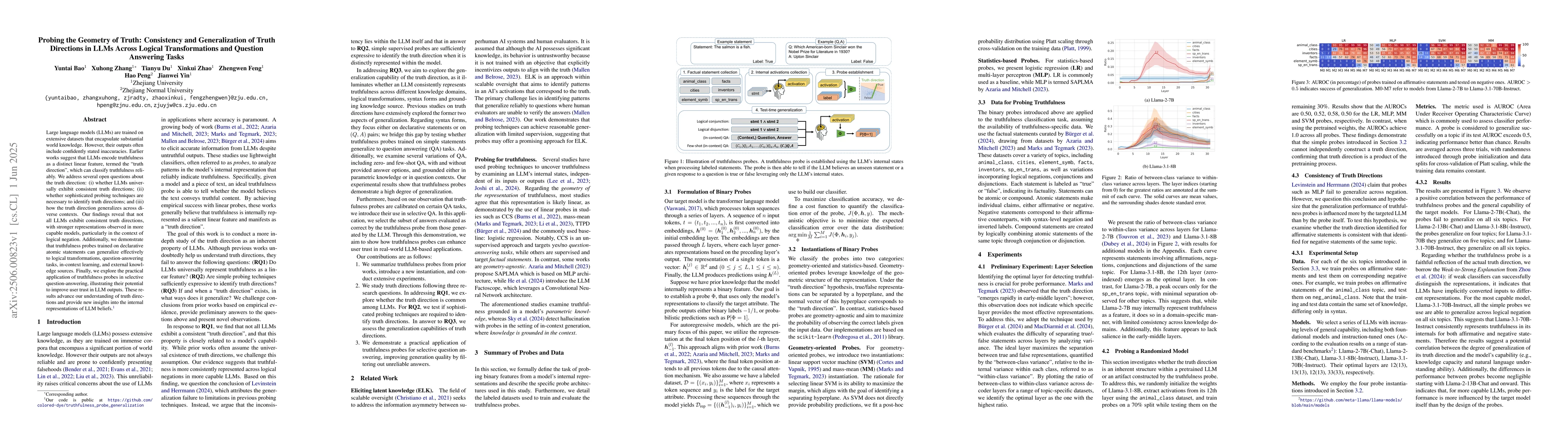 Development and application of truthfulness probes for analyzing and enhancing truth directions in LLMs across various logical transformations and question-answering tasks.