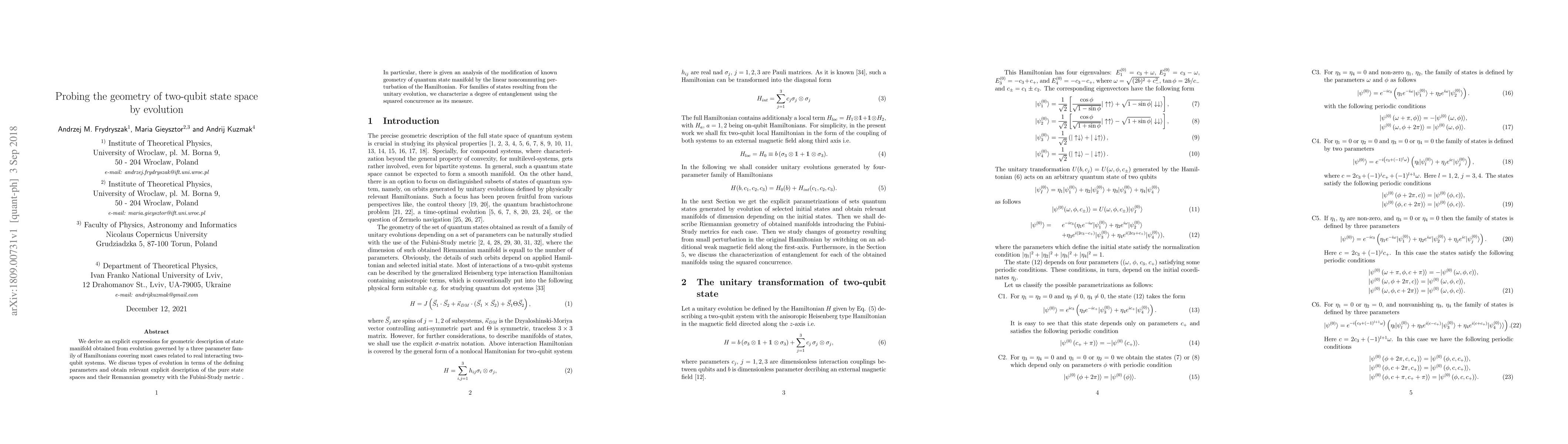 The research derives explicit expressions for the geometric description of state manifolds obtained from evolution governed by a three-parameter family of Hamiltonians relevant for real interacting two-qubit systems.