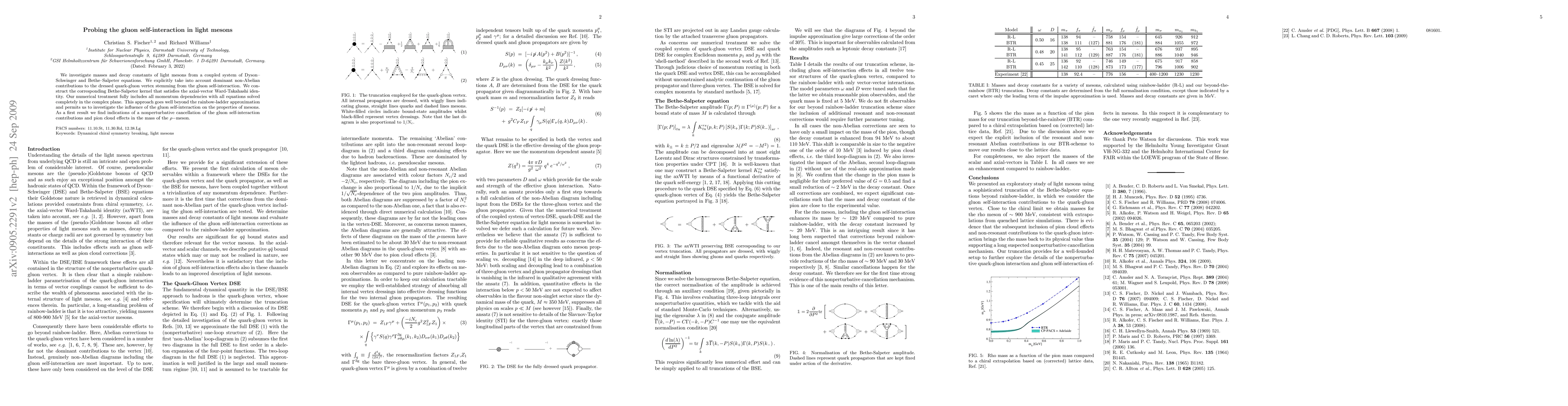 This study uses advanced Dyson-Schwinger and Bethe-Salpeter equations to explore the gluon self-interaction's impact on light meson properties, revealing a nonperturbative cancellation effect in the rho-meson's mass. The approach fully considers non-Abelian contributions and solves equations in the complex plane, surpassing the rainbow-ladder approximation.