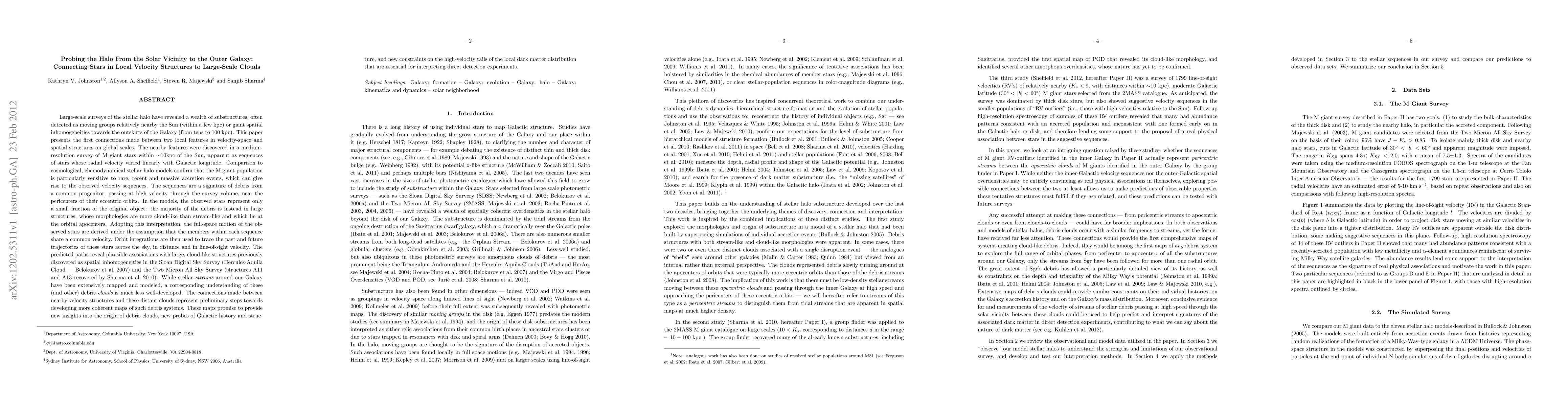 (Abridged) This paper presents the first connections made between two local features in velocity-space found in a survey of M giant stars and stellar spatial inhomogeneities on global scales. Comparison to cosmological, chemodynamical stellar halo models confirm that the M giant population is particularly sensitive to rare, recent and massive accretion events. These events can give rise to local observed velocity sequences - a signature of a small fraction of debris from a common progenitor, passing at high velocity through the survey volume, near the pericenters of their eccentric orbits. The majority of the debris is found in much larger structures, whose morphologies are more cloud-like than stream-like and which lie at the orbital apocenters. Adopting this interpretation, the full-space motions represented by the observed velocity features are derived under the assumption that the members within each sequence share a common velocity. Orbit integrations are then used to trace the past and future trajectories of these stars across the sky revealing plausible associations with large, previously-discovered, cloud-like structures. The connections made between nearby velocity structures and these distant clouds represent preliminary steps towards developing coherent maps of such giant debris systems. These maps promise to provide new insights into the origin of debris clouds, new probes of Galactic history and structure, and new constraints on the high-velocity tails of the local dark matter distribution that are essential for interpreting direct detection experiments.