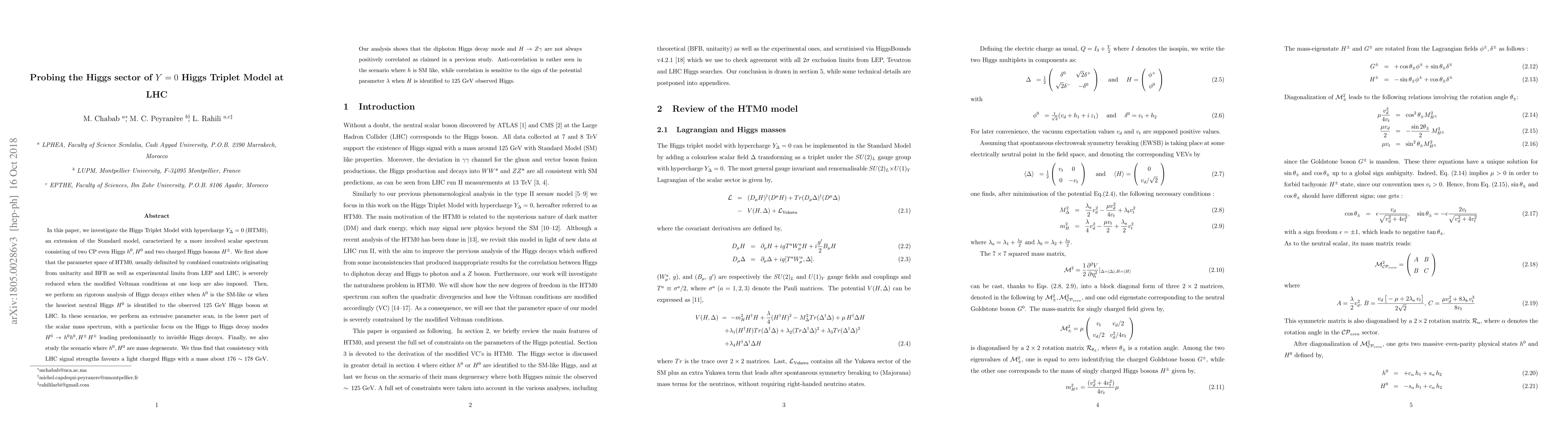In this paper, we investigate the Higgs Triplet Model with hypercharge $Y_{\Delta}=0$ (HTM0), an extension of the Standard model, caracterised by a more involved scalar spectrum consisting of two CP even Higgs $h^0, H^0$ and two charged Higgs bosons $H^\pm$. We first show that the parameter space of HTM0, usually delimited by combined constraints originating from unitarity and BFB as well as experimental limits from LEP and LHC, is severely reduced when the modified Veltman conditions at one loop are also imposed. Then, we perform an rigorous analysis of Higgs decays either when $h^0$ is the SM-like or when the heaviest neutral Higgs $H^0$ is identified to the observed $125$ GeV Higgs boson at LHC. In these scenarios, we perform an extensive parameter scan, in the lower part of the scalar mass spectrum, with a particular focus on the Higgs to Higgs decay modes $H^0 \to h^0h^0, H^\pm\,H^\mp$ leading predominantly to invisible Higgs decays. Finally, we also study the scenario where $h^0, H^0$ are mass degenerate. We thus find that consistency with LHC signal strengths favours a light charged Higgs with a mass about $176\sim178$ GeV. Our analysis shows that the diphoton Higgs decay mode and $H \to Z \gamma$ are not always positively correlated as claimed in a previous study. Anti-correlation is rather seen in the scenario where $h$ is SM like, while correlation is sensitive to the sign of the potential parameter $\lambda$ when $H$ is identified to $125$ GeV Higgs.