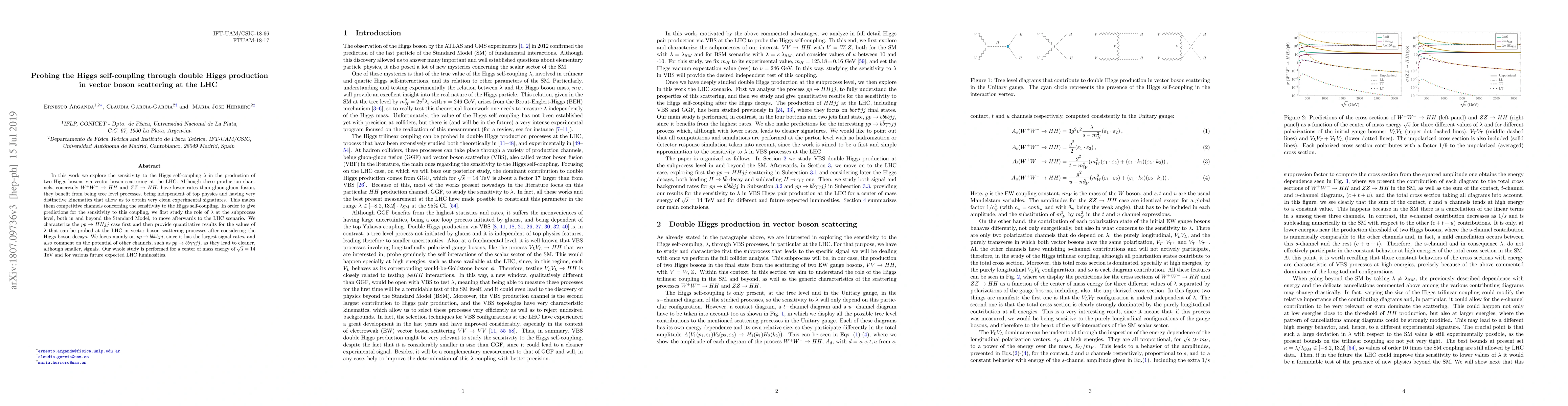 In this work we explore the sensitivity to the Higgs self-coupling $\lambda$ in the production of two Higgs bosons via vector boson scattering at the LHC. Although these production channels, concretely $W^+W^- \to HH$ and $ ZZ \to HH$, have lower rates than gluon-gluon fusion, they benefit from being tree level processes, being independent of top physics and having very distinctive kinematics that allow to obtain very clean experimental signatures. This makes them competitive channels concerning the sensitivity to the Higgs self-coupling. In order to give predictions for the sensitivity to this coupling, we first study the role of $\lambda$ at the subprocess level, both in and beyond the Standard Model, to move afterwards to the LHC scenario. We characterize the $pp\to HHjj$ case first and then provide quantitative results for the values of $\lambda$ that can be probed at the LHC in vector boson scattering processes after considering the Higgs boson decays. We focus mainly in $pp\to b\bar{b}b\bar{b}jj$, since it has the largest signal rates, and also comment on the potential of other channels, such as $pp\to b\bar{b}\gamma\gamma jj$, as they lead to cleaner, although smaller, signals. Our whole study is performed for a center of mass energy of $\sqrt{s}=14$ TeV and for various future expected LHC luminosities.