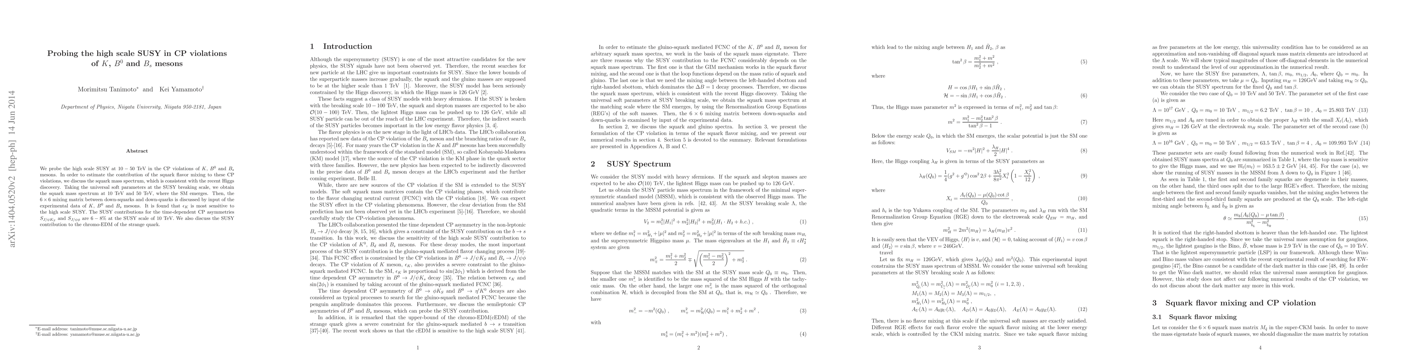 We probe the high scale SUSY at 10-50 TeV in the CP violations of K, B0 and Bs mesons. In order to estimate the contribution of the squark flavor mixing to these CP violations, we discuss the squark mass spectrum, which is consistent with the recent Higgs discovery. Taking the universal soft parameters at the SUSY breaking scale, we obtain the squark mass spectrum at 10 TeV and 50 TeV, where the SM emerges. Then, the 6times6 mixing matrix between down-squarks and down-quarks is discussed by input of the experimental data of K, B0 and Bs mesons.It is found that epsilon_K is most sensitive to the high scale SUSY. The SUSY contributions for the time-dependent CP asymmetries S_{ J/psi K_S} and S_{ J/psi phi} are 6-8% at the SUSY scale of 10 TeV. We also discuss the SUSY contribution to the chromo-EDM of the strange quark.