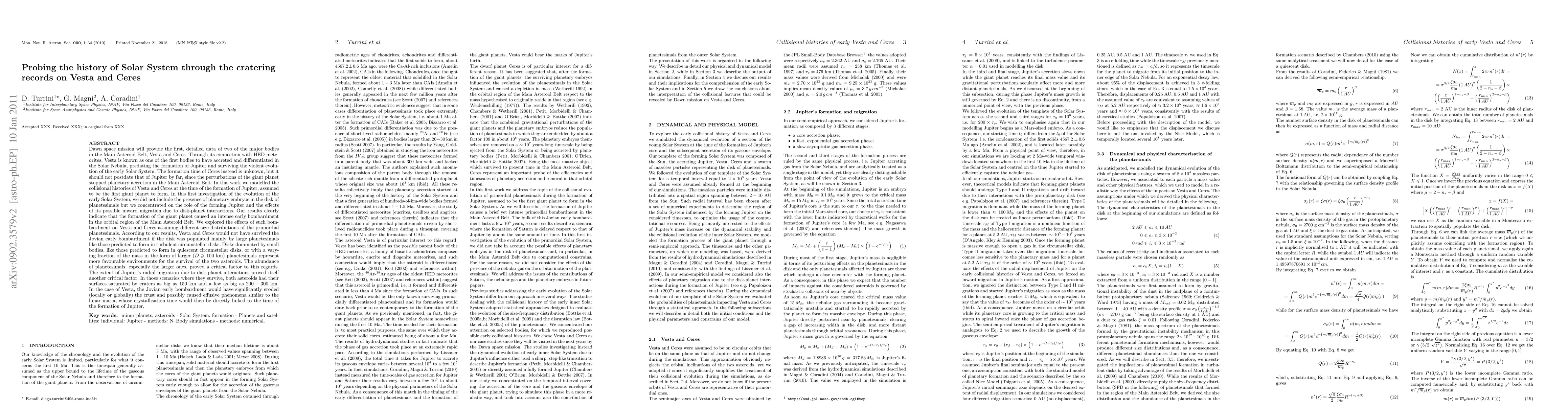 This study models the collisional histories of Vesta and Ceres during Jupiter's formation, revealing that the giant planet's early bombardment heavily impacted the Main Asteroid Belt. The survival of Vesta and Ceres depends on the size distribution of planetesimals in the early Solar System, suggesting a turbulent disk with larger planetesimals would have destroyed them, while a more quiescent disk with a mix of sizes would allow their survival.