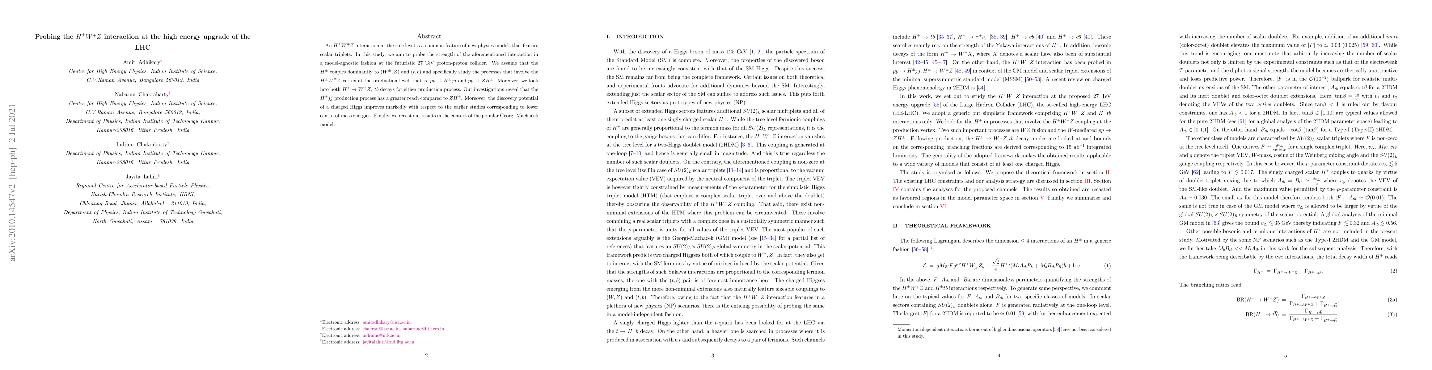 An $H^\pm W^\mp Z$ interaction at the tree level is common feature of new physics models that feature scalar triplets. In this study, we aim to probe the strength of the aforementioned interaction in a model-agnostic fashion at the futuristic 27 TeV proton-proton collider. We assume that the $H^\pm$ couples dominantly to ($W^\pm,Z$) and ($t,b$). We specifically study the processes that involve the $H^\pm W^\mp Z$ vertex at the production level, that is, $p p \to H^\pm j j$ and $p p \to Z H^\pm$. Moreover, we look into both $H^\pm \to W^\pm Z,~t b$ decays for either production process. Our investigations reveal that the $H^\pm j j$ production process has a greater reach compared to $Z H^\pm$. Moreover, the discovery potential of a charged Higgs improves markedly with respect to the earlier studies corresponding to lower centre-of-mass energies. Finally, we recast our results in the context of the popular Georgi-Machacek model.
