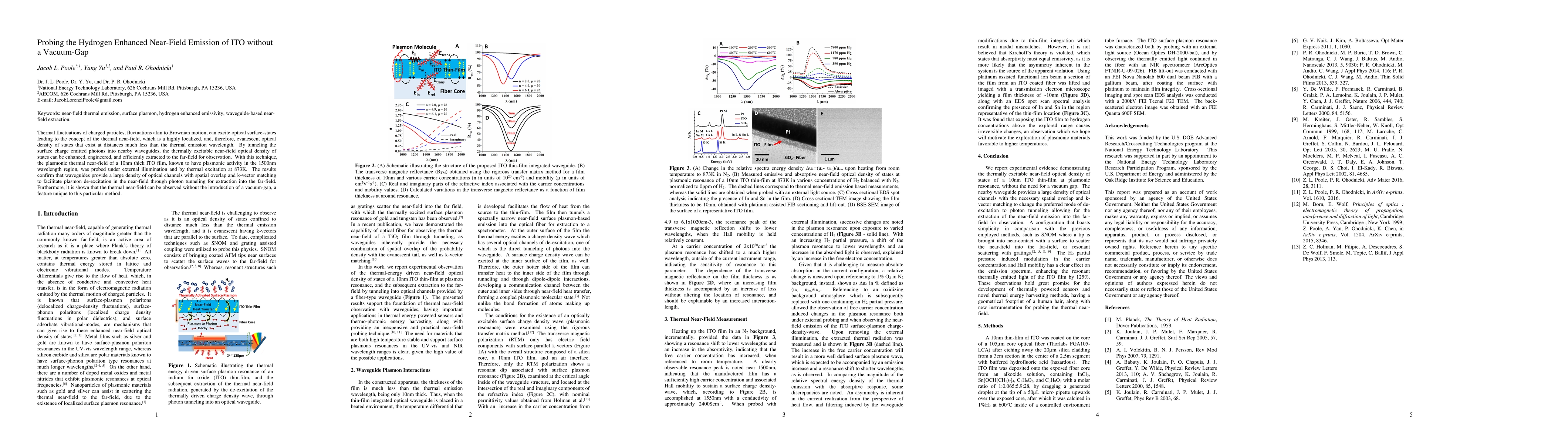 This paper investigates the hydrogen-enhanced near-field emission of indium tin oxide (ITO) without a vacuum-gap, demonstrating that waveguides can efficiently extract thermally excitable near-field optical states via photon tunneling. The study confirms the method's effectiveness in observing the plasmonic thermal near-field through external illumination and thermal excitation at 873K.