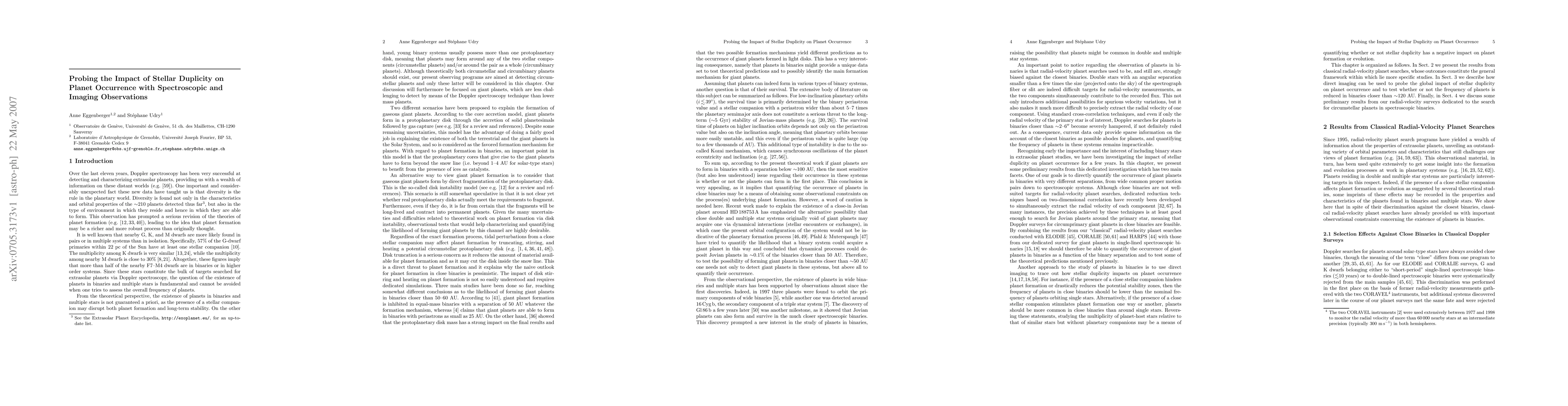 This paper investigates the influence of stellar duplicity on planet occurrence through spectroscopic and imaging observations, revealing reduced planet occurrence in binaries closer than ~120 AU. The study employs adaptive optics imaging and radial-velocity monitoring, with preliminary results indicating circumprimary giant planets can be detected in various spectroscopic binaries.