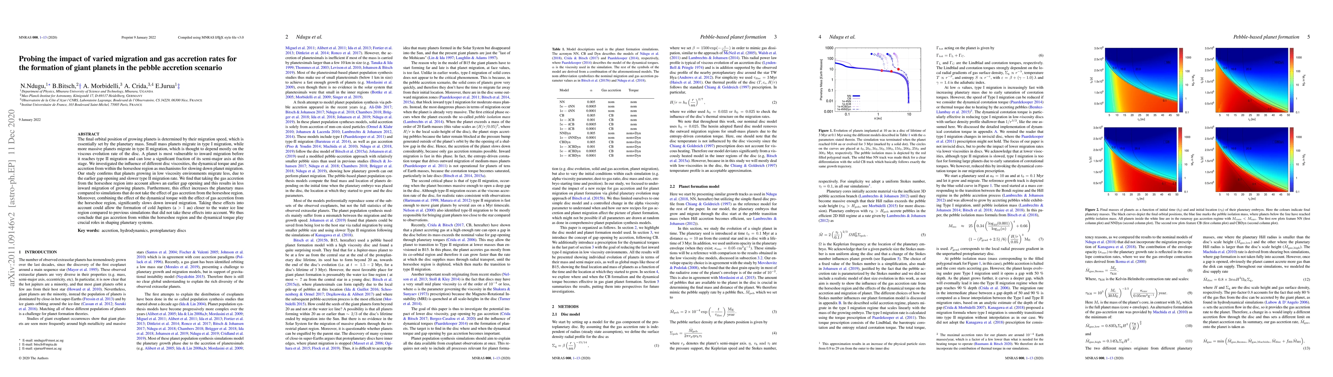 This paper investigates the impact of varying migration and gas accretion rates on giant planet formation via pebble accretion, finding that low viscosity environments and gas accretion from the horseshoe region slow down planet migration, potentially enabling the formation of cold Jupiters closer to the water ice line. The study highlights the importance of dynamical torque and gas accretion in shaping planetary systems.