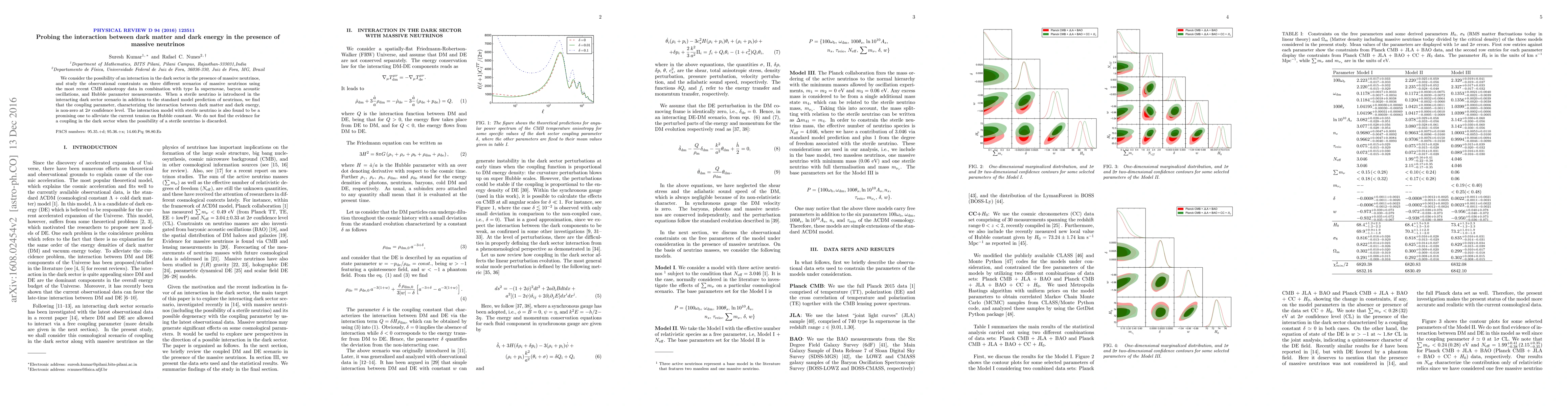 This paper explores interactions between dark matter and dark energy in the context of massive neutrinos, particularly focusing on a sterile neutrino. It finds a non-zero coupling parameter at 2σ confidence level, suggesting an interaction, and proposes this model as a potential solution to the Hubble constant tension. Without a sterile neutrino, no significant coupling evidence is found.