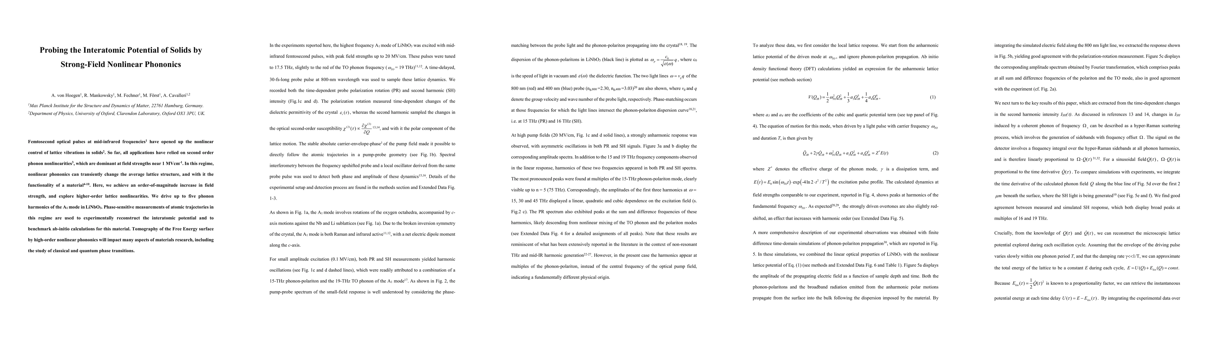 Femtosecond optical pulses at mid-infrared frequencies have opened up the nonlinear control of lattice vibrations in solids. So far, all applications have relied on second order phonon nonlinearities, which are dominant at field strengths near 1 MVcm-1. In this regime, nonlinear phononics can transiently change the average lattice structure, and with it the functionality of a material. Here, we achieve an order-of-magnitude increase in field strength, and explore higher-order lattice nonlinearities. We drive up to five phonon harmonics of the A1 mode in LiNbO3. Phase-sensitive measurements of atomic trajectories in this regime are used to experimentally reconstruct the interatomic potential and to benchmark ab-initio calculations for this material. Tomography of the Free Energy surface by high-order nonlinear phononics will impact many aspects of materials research, including the study of classical and quantum phase transitions.