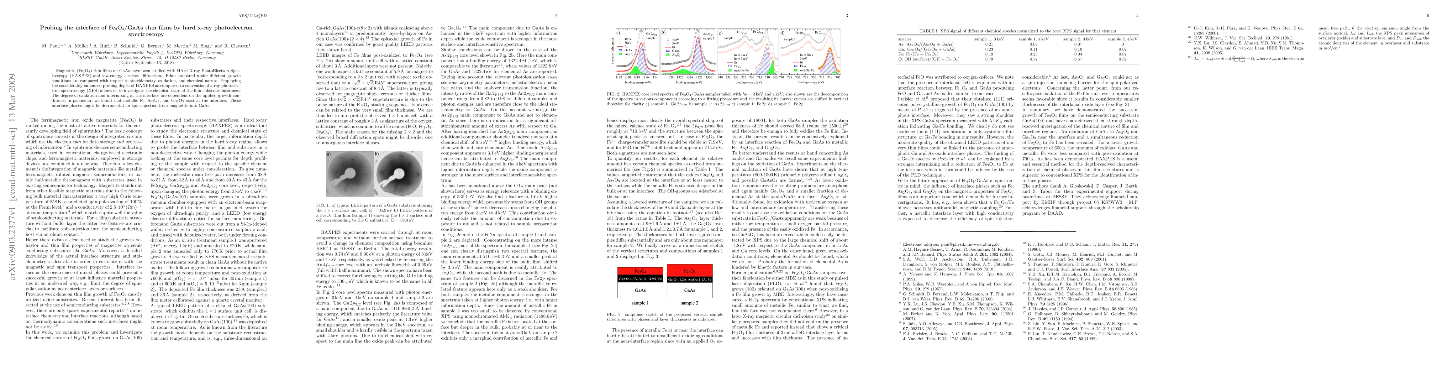 This study investigates Fe3O4/GaAs thin films using HAXPES and low-energy electron diffraction to analyze stoichiometry, oxidation, and chemical nature. The enhanced probing depth reveals metallic Fe, As2O3, and Ga2O3 at the interface, which may hinder spin injection from magnetite into GaAs.