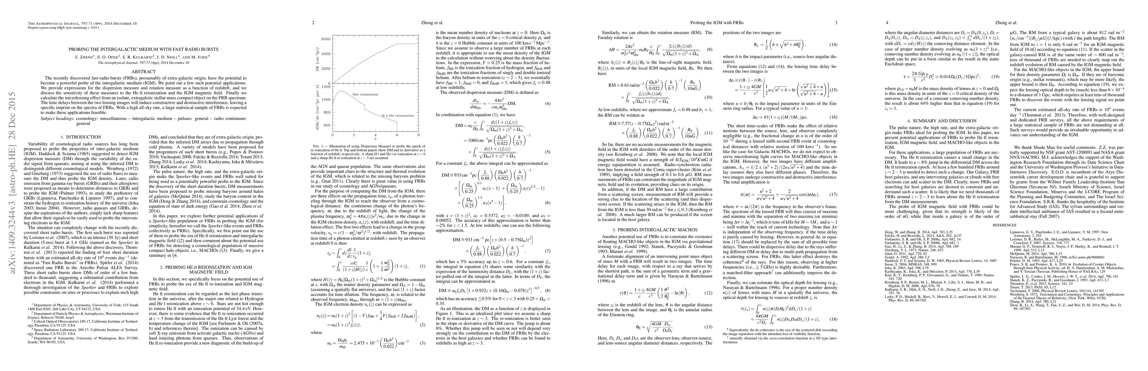 This paper explores the use of fast radio bursts (FRBs) as a tool to probe the intergalactic medium (IGM), discussing their potential to reveal information about HeII reionization and the IGM magnetic field. It also examines the microlensing effect caused by extragalactic compact objects, which can leave a unique spectral imprint on FRBs.