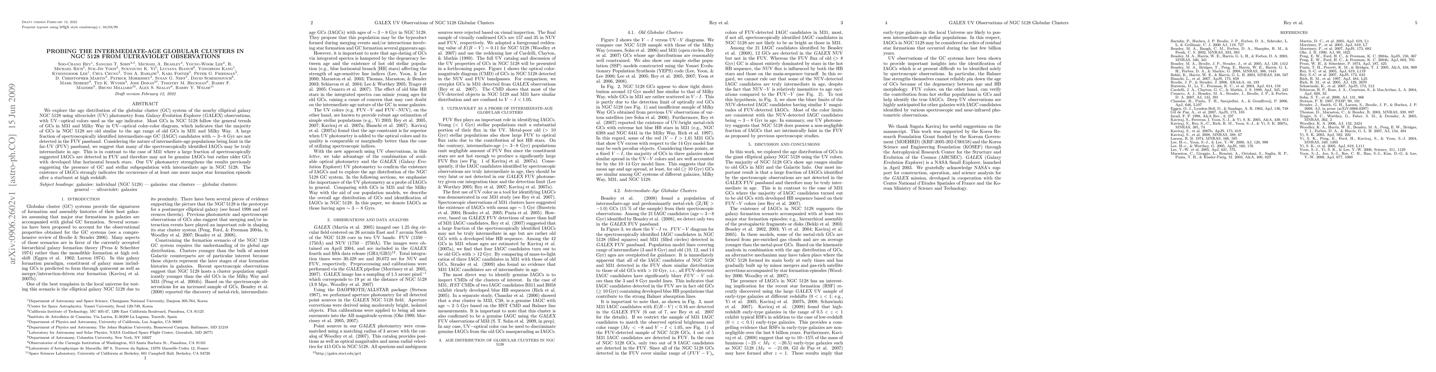 We explore the age distribution of the globular cluster (GC) system of the nearby elliptical galaxy NGC 5128 using ultraviolet (UV) photometry from Galaxy Evolution Explorer (GALEX) observations, with UV - optical colors used as the age indicator. Most GCs in NGC 5128 follow the general trends of GCs in M31 and Milky Way in UV - optical color-color diagram, which indicates that the majority of GCs in NGC 5128 are old similar to the age range of old GCs in M31 and Milky Way. A large fraction of spectroscopically identified intermediate-age GC (IAGC) candidates with ~ 3-8 Gyr are not detected in the FUV passband. Considering the nature of intermediate-age populations being faint in the far-UV (FUV) passband, we suggest that many of the spectroscopically identified IAGCs may be truly intermediate in age. This is in contrast to the case of M31 where a large fraction of spectroscopically suggested IAGCs are detected in FUV and therefore may not be genuine IAGCs but rather older GCs with developed blue horizontal branch stars. Our UV photometry strengthens the results previously suggesting the presence of GC and stellar subpopulation with intermediate age in NGC 5128. The existence of IAGCs strongly indicates the occurrence of at least one more major star formation episode after a starburst at high redshift.