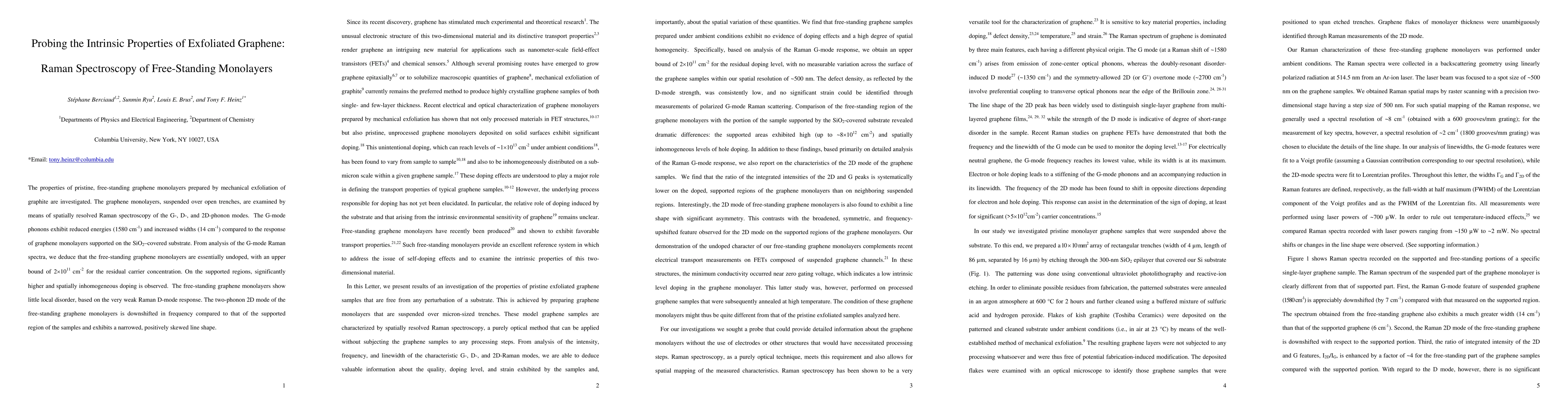 This study investigates the intrinsic properties of free-standing graphene monolayers via Raman spectroscopy, revealing reduced G-mode phonon energies and increased widths, indicating minimal doping and disorder. The 2D-mode is downshifted and exhibits a narrowed, positively skewed line shape compared to supported graphene regions.