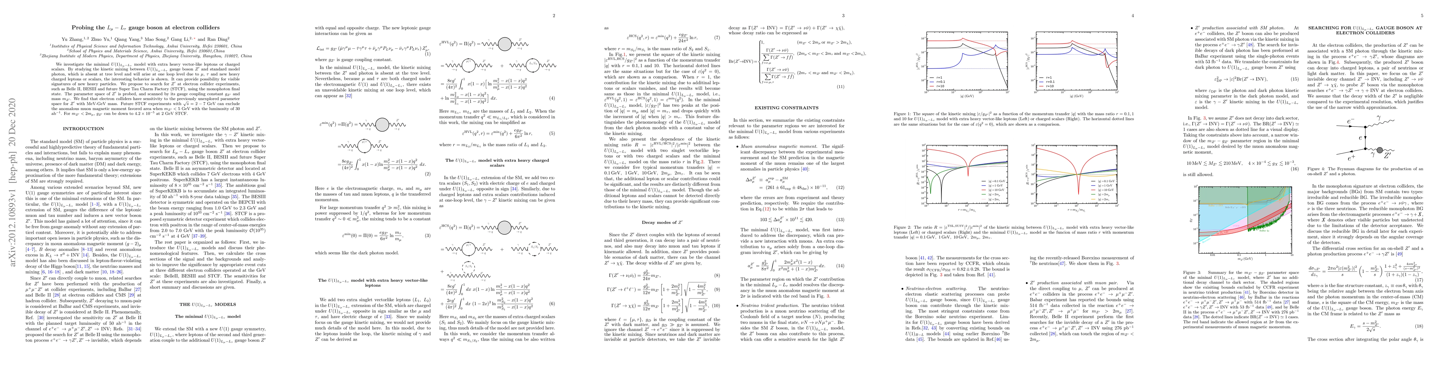We investigate the minimal $U(1)_{L_\mu-L_\tau}$ model with extra heavy vector-like leptons or charged scalars. By studying the kinetic mixing between $U(1)_{L_\mu-L_\tau}$ gauge boson $Z^\prime$ and standard model photon, which is absent at tree level and will arise at one loop level due to $\mu$, $\tau$ and new heavy charged leptons or scalars, the interesting behavior is shown. It can provide possibility for visible signatures of new heavy particles. We propose to search for $Z^\prime$ at electron collider experiments, such as Belle II, BESIII and future Super Tau Charm Factory (STCF), using the monophoton final state. The parameter space of $Z^\prime$ is probed, and scanned by its gauge coupling constant $g_{Z^\prime}$ and mass $m_{Z^\prime}$. We find that electron colliders have sensitivity to the previously unexplored parameter space for $Z^\prime$ with MeV-GeV mass. Future STCF experiments with $\sqrt s=2-7$ GeV can exclude the anomalous muon magnetic moment favored area when $m_{Z^\prime}<5$ GeV with the luminosity of 30 ab$^{-1}$. For $m_{Z^\prime} < 2m_\mu$, $g_{Z^\prime}$ can be down to $4.2\times 10^{-5}$ at 2 GeV STCF.